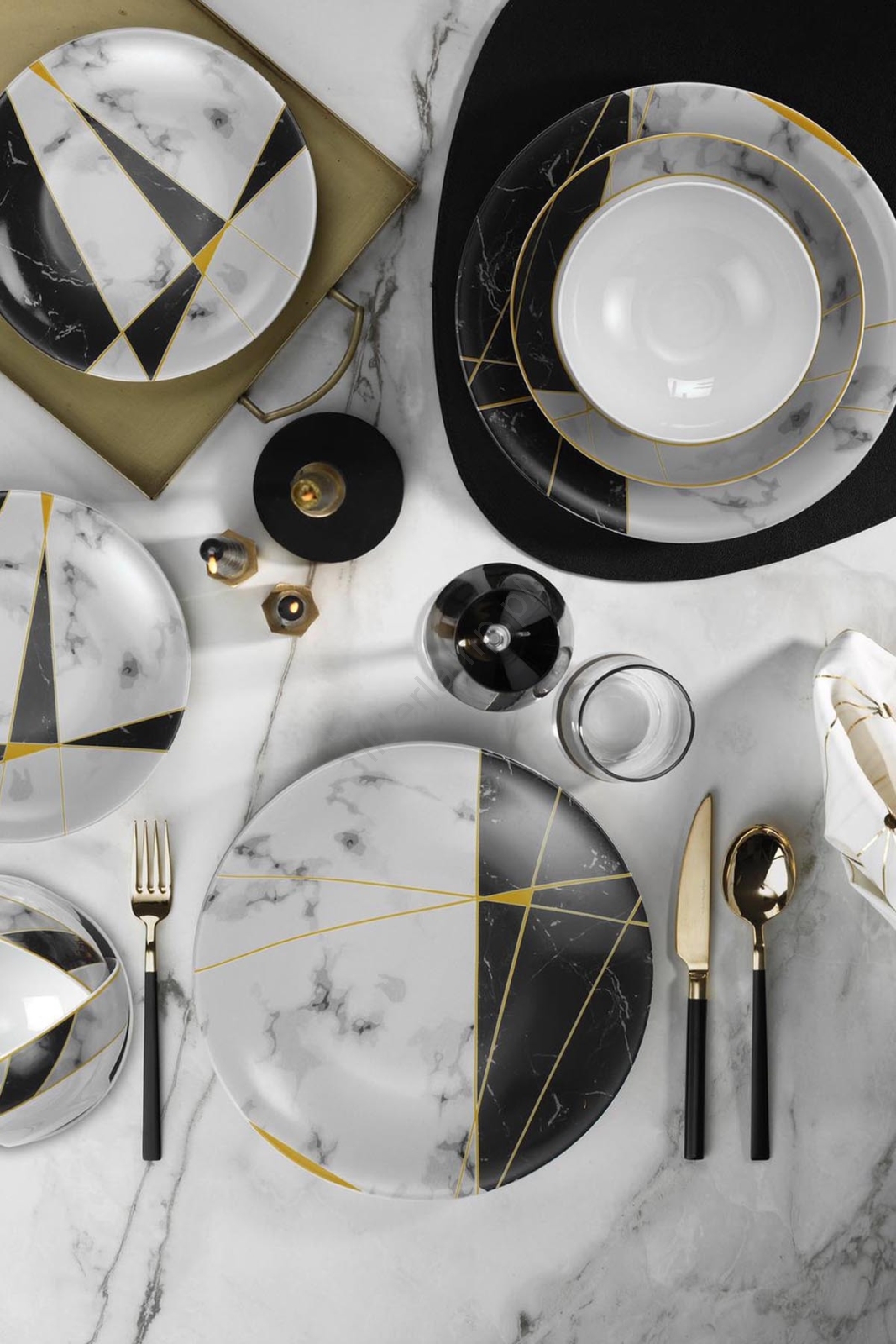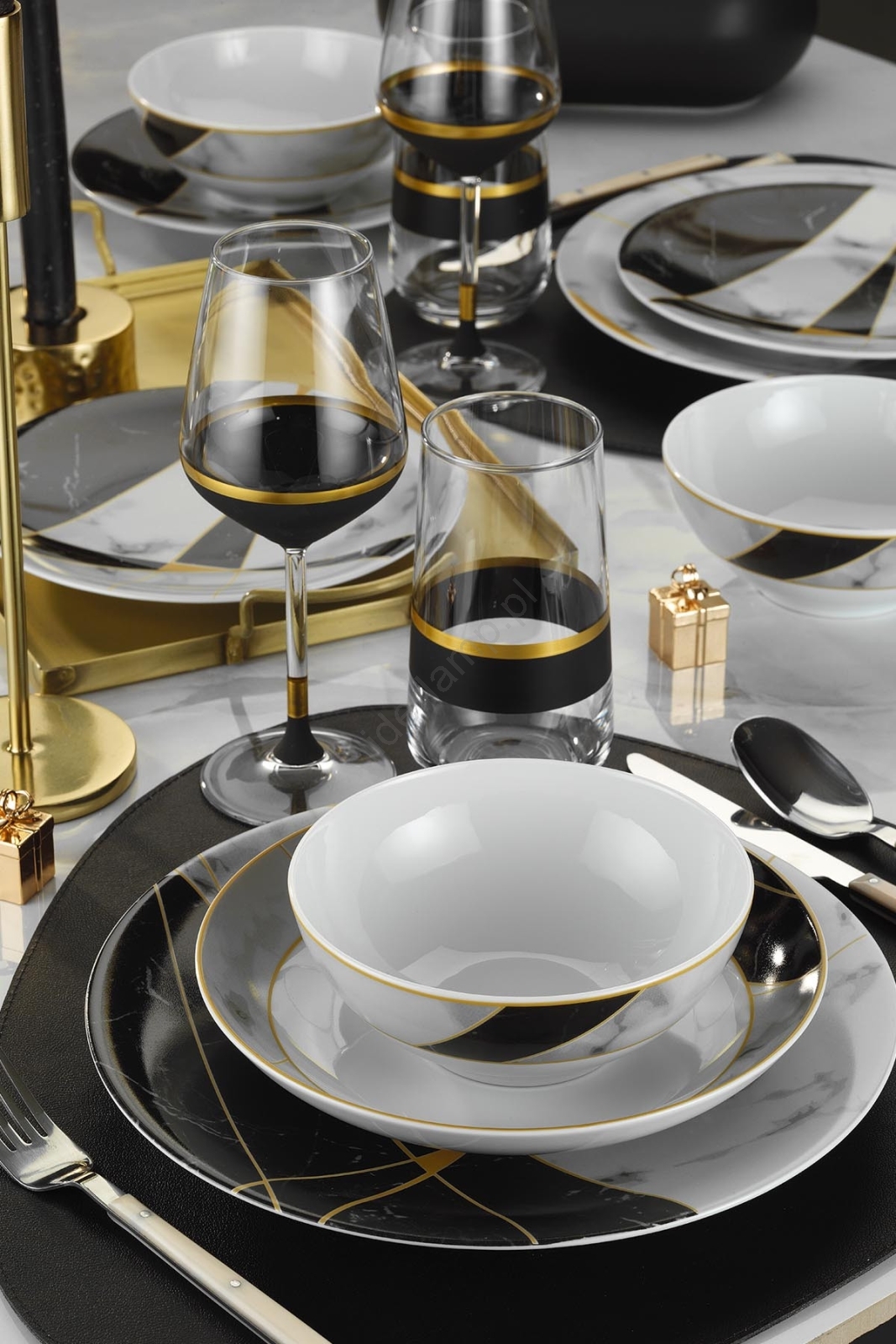 24-częściowy zestaw obiadowy — czarny/biały/złoty, porcelana