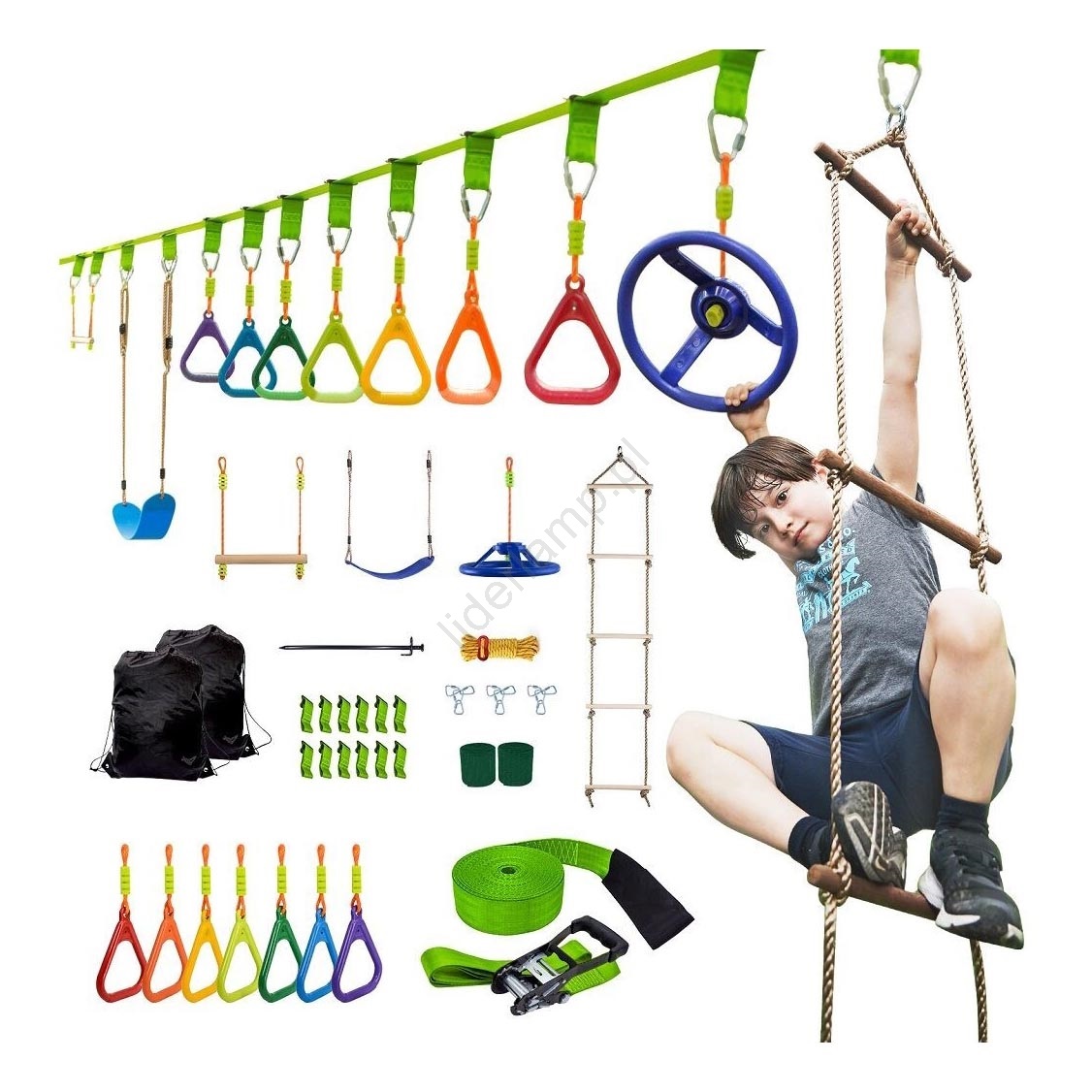 • Zawartość opakowania: 1 szt. slackline, 1 szt. napinacz, 14 szt. taśma z klamrą, 14 szt. karabinek trójkątny, 2 szt. ochraniacz na drzewo, 1 szt. huśtawka, 7 szt. kółka gimnastyczne, 1 szt. plastikowa kierownica, 1 szt. drążek, 1 szt. drabinka, 1 zestaw kleju, 2 szt. torba do przechowywania, 1 szt. kołek (wraz z liną służy do mocowania drabinki wspinaczkowej do ziemi), 1 szt. lina.