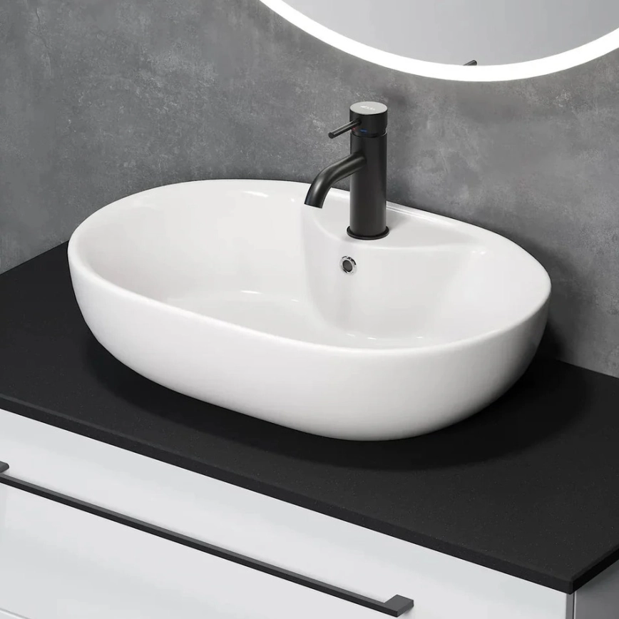 • Umywalka przeznaczona do montażu na blacie, co pozwala na elastyczne ustawienie i łączenie z różnymi rodzajami blatów łazienkowych.
