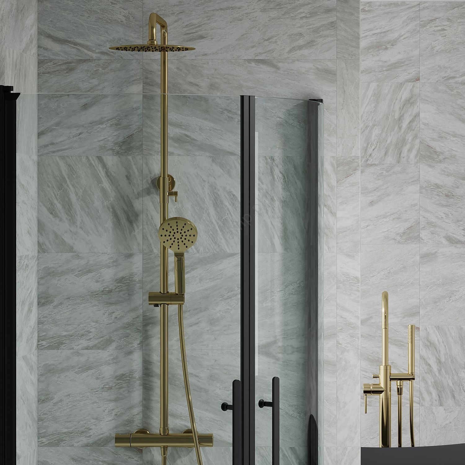 • Drążek prysznicowy i deszczownica ze stali nierdzewnej, wykończone powłoką PVD.