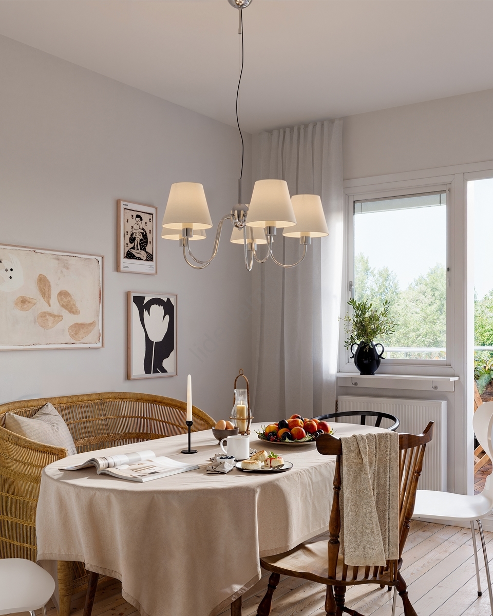 ByRydens - Żyrandol na lince LYNF 5xE14/8W/230V błyszczący chrom/biały charakteryzuje się ładnym i funkcjonalnym designem.  Do lampy pasuje żarówka z trzonkiem E14. Tutaj kupisz inne żarówki w korzystnych cenach. Będziesz mieć ciekawy dodatek do swojego domu.