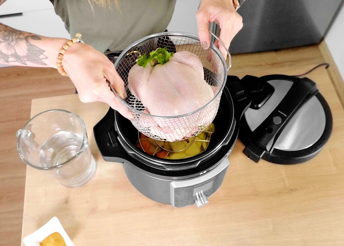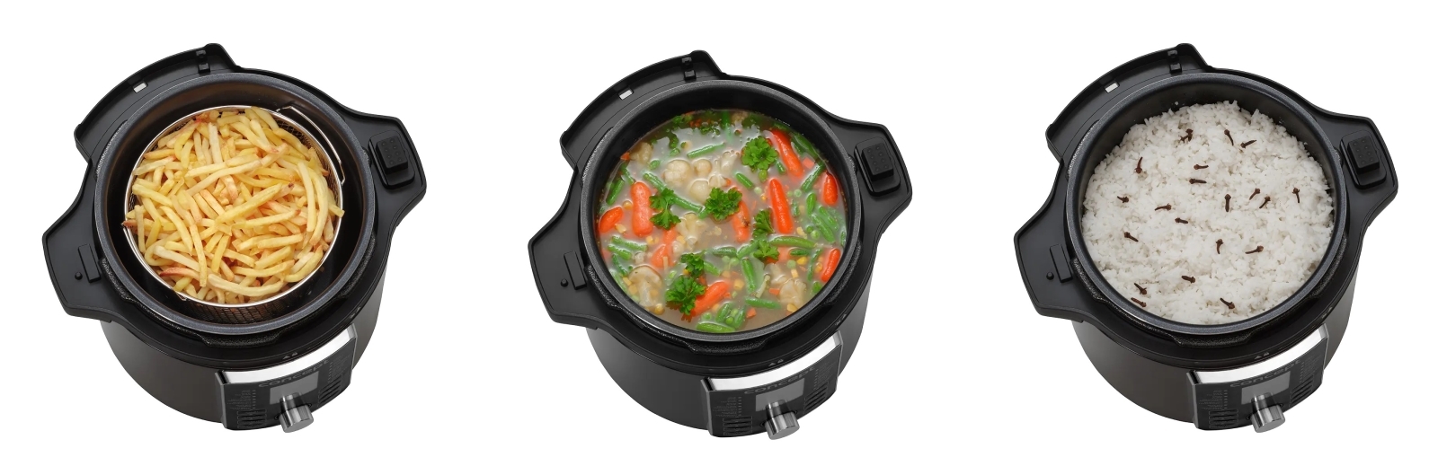 • 11 w 1: parowar, frytkownica powietrzna (airfryer), szybkowar, wolnowar, ryżowar, garnek do zupy, piekarnik, suszarka do żywności, jogurtownica, patelnia, gotowanie.