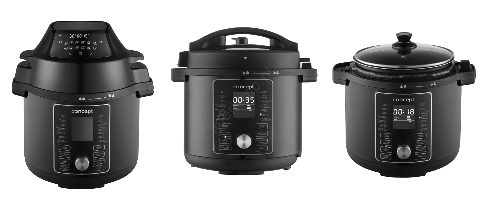 • 3x pokrywki: ciśnieniowa, do gorącego powietrza, szklana do wolnego gotowania.