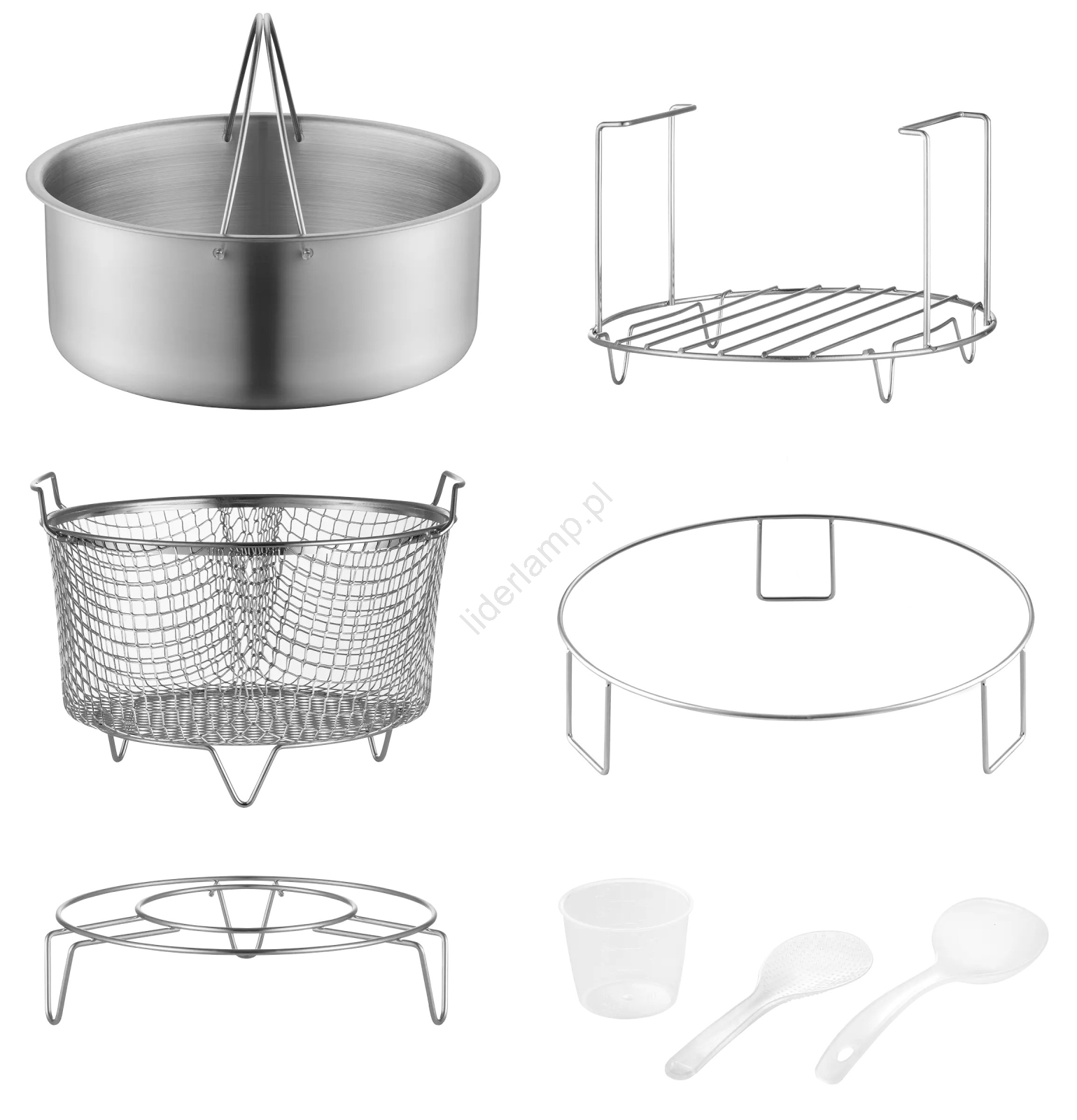 • Akcesoria: kosz do frytkownicy 3,5 l, stojak na pokrywki, garnek do gotowania na parze, stojak do gotowania na parze, tacka grillowa, miarka (do ryżu), płaska plastikowa łyżka, plastikowa chochla, pojemnik na kondensat (na nadmiar wody).