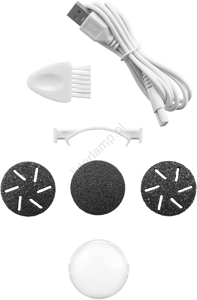 • Akcesoria: 3 końcówki (drobnoziarnista, średnioziarnista, gruboziarnista), kabel USB do ładowania, osłona ochronna, szczoteczka czyszcząca.
