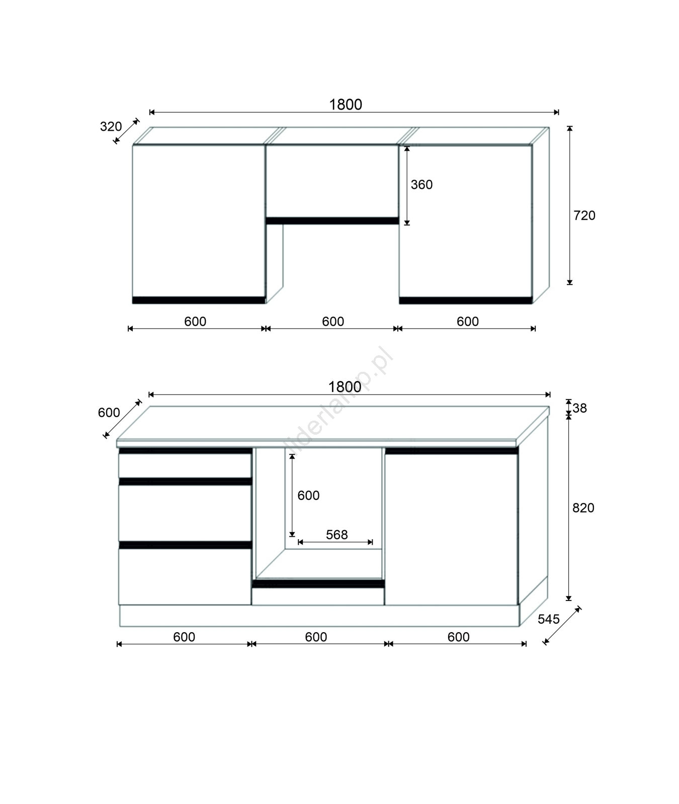 • W zestawie nie ma urządzeń AGD, zlewozmywaka ani baterii kuchennej.