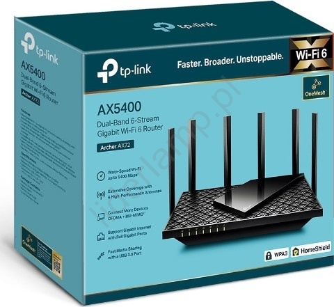 • Router tworzy silną i stabilną sieć bezprzewodową, korzystając z najnowszego standardu Wi-Fi 6, dzięki czemu obsługuje więcej połączeń jednocześnie i zmniejsza opóźnienia.