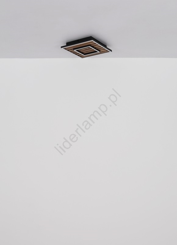 • Kształt kwadratu z czarną ramą, uzupełniony płytą MDF z imitacją ciemnego drewna oraz mlecznym plastikowym kloszem.