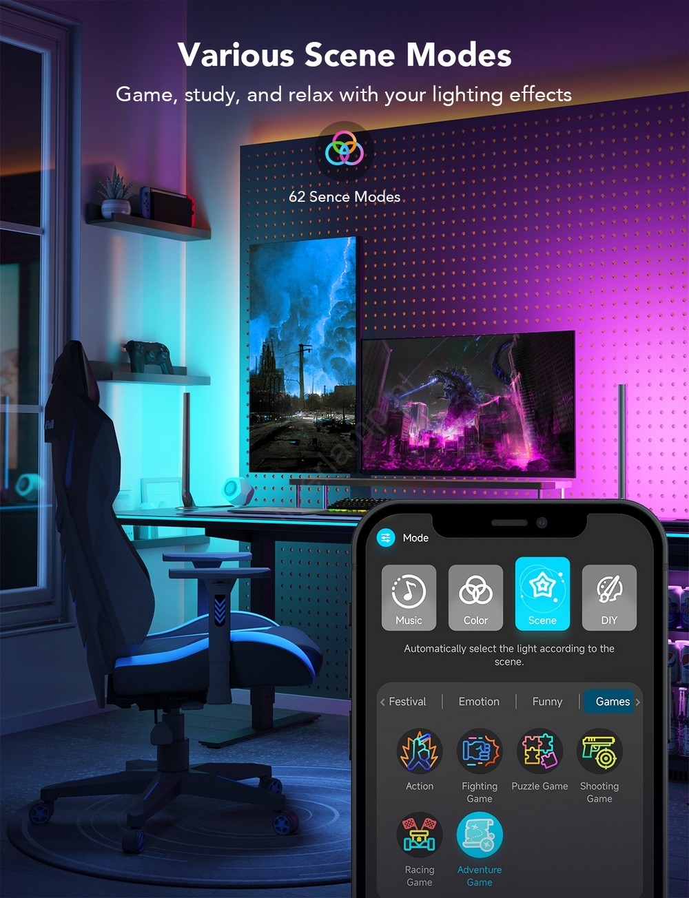 • Tryb muzyczny – światła reagują na rytm i dźwięk, ożywiając każdą grę i film.