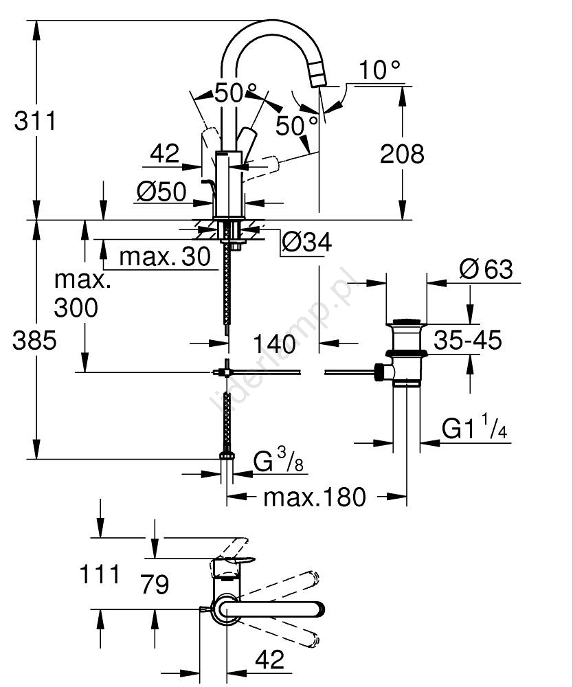 • Wysoki, obrotowy wylew z opcją kąta obrotu: 0°, 150° lub 360° dla maksymalnego komfortu.