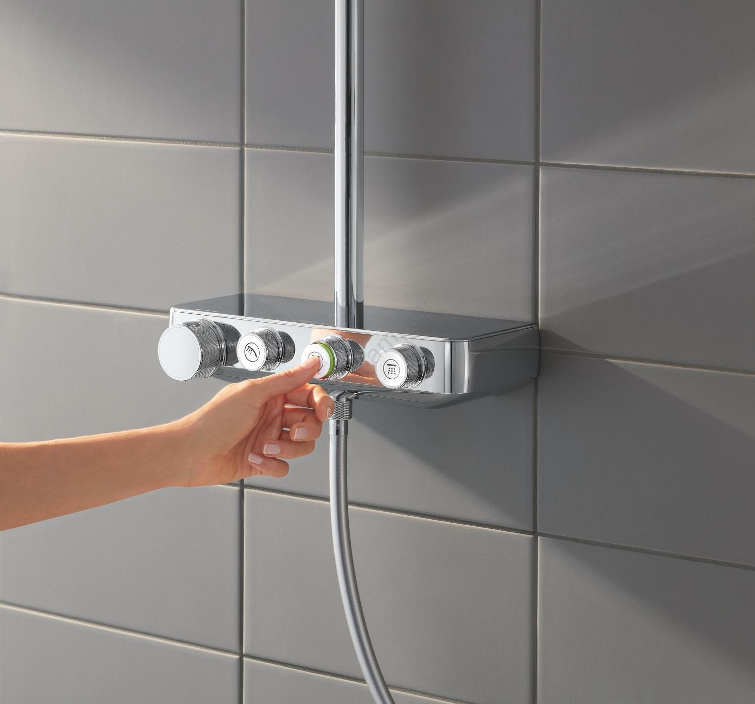 • Ścienna bateria termostatyczna SmartControl umożliwia łatwe przełączanie między deszczownicą a słuchawką prysznicową.