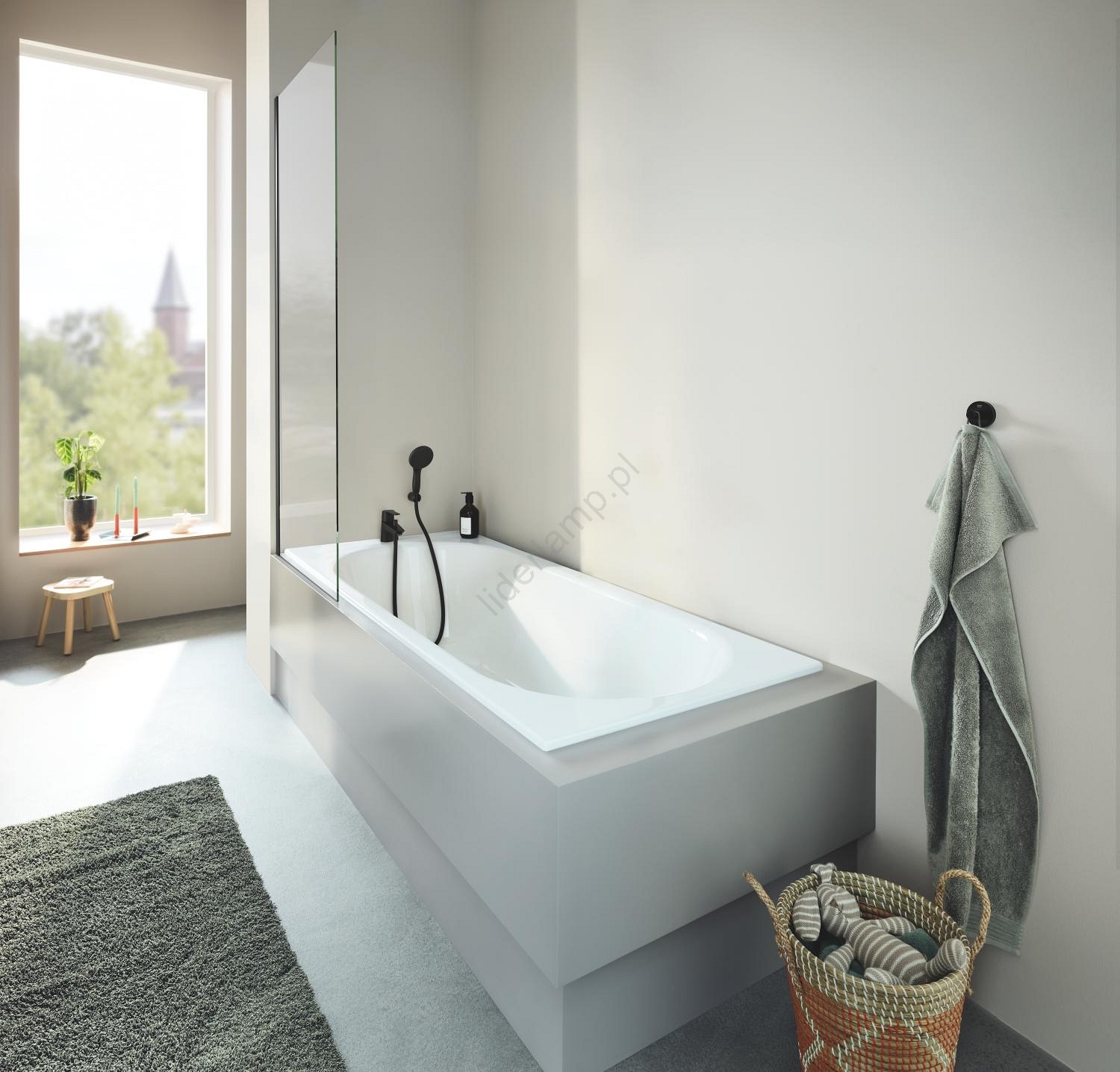 • czarne wykończenie powierzchni dla nowoczesnego wyglądu łazienki.
