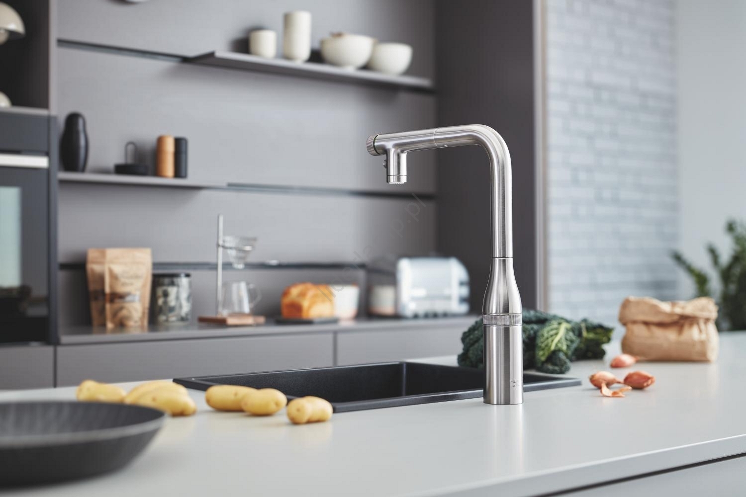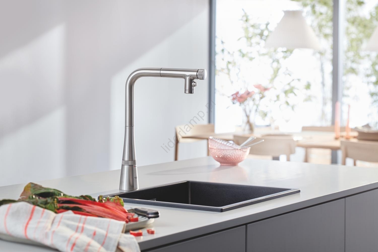 • Nowoczesny kompozytowy zlew GROHE K700U dla eleganckiego wyglądu kuchni.