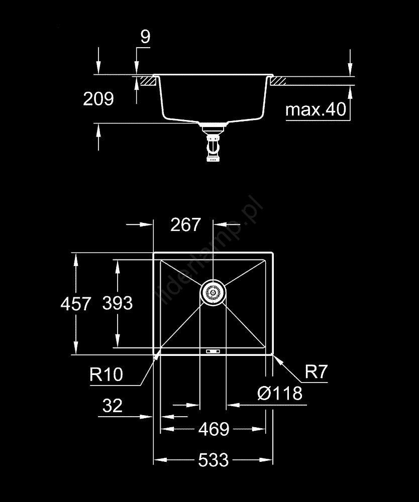• Wycięcie pod montaż nawierzchniowy: 518 x 442 mm; pod montaż podblatowy: 468 x 390 mm.