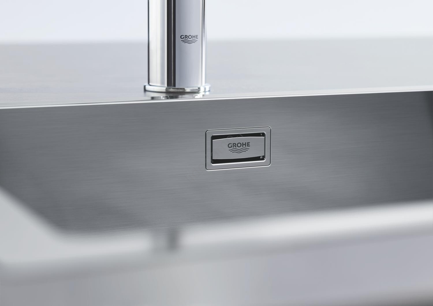 • Nowoczesny zlew ze stali nierdzewnej GROHE K700 o industrialnym designie.