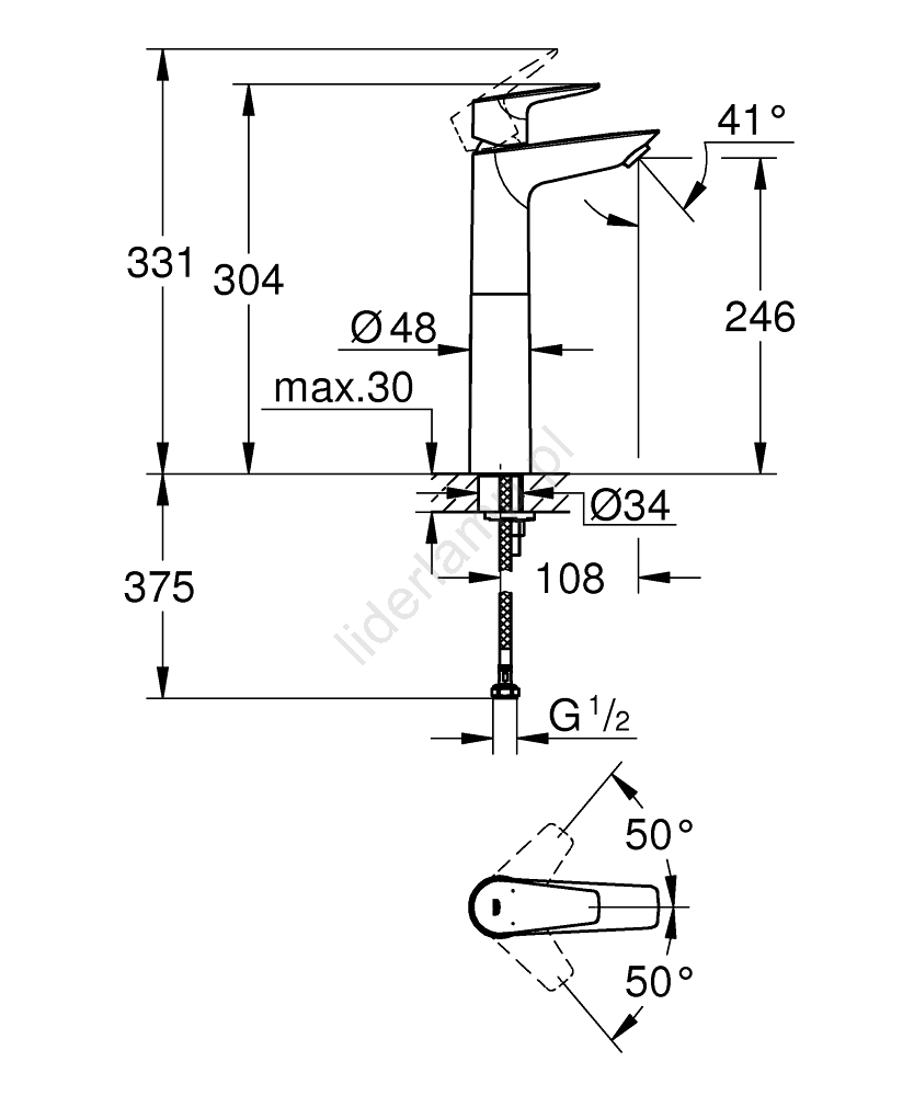 • Wysokość baterii 304 mm i długość wylewki 108 mm zapewniają wystarczająco dużo miejsca do wygodnego użytkowania.