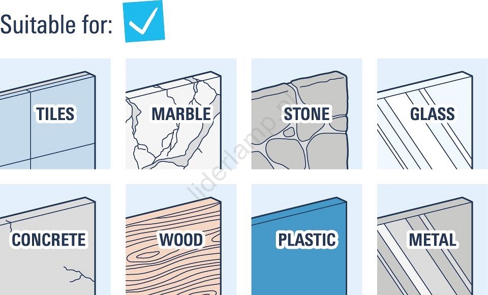 • Możliwość montażu przez wiercenie (śruby i kołki rozporowe w zestawie) lub przyklejenia za pomocą kleju GROHE QuickGlue (sprzedawany osobno).