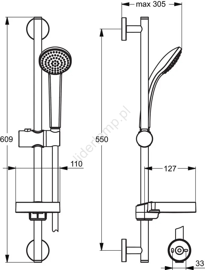 • Drążek prysznicowy ma długość 600 mm i jest wyposażony w metalowy, przesuwany uchwyt słuchawki.