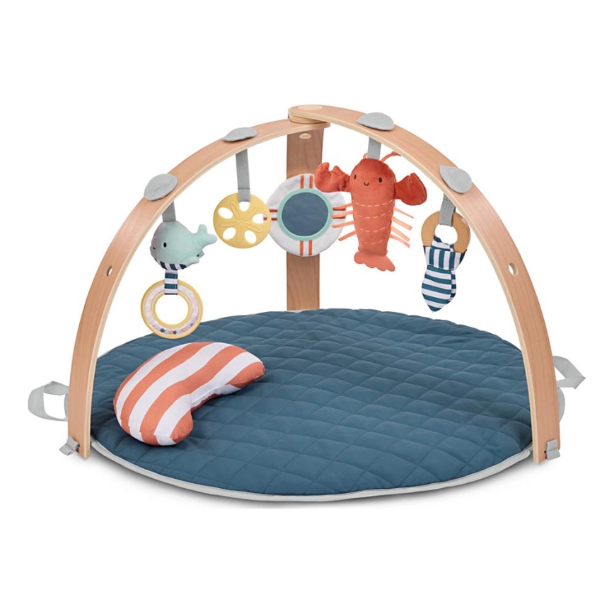 • W zestawie 5 odpinanych zabawek z wysokiej jakości materiałów: pluszowy homar z dzwoneczkiem, drewniany pierścień z materiałową zawieszką, grzechoczący wieloryb, lusterko w kształcie koła ratunkowego oraz gryzak.