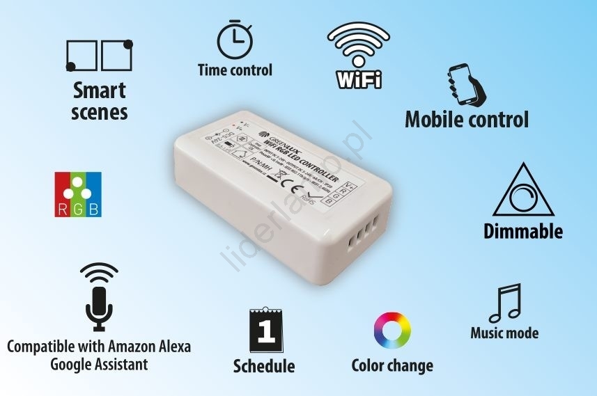 • Inteligentny kontroler jest przeznaczony do sterowania kolorowymi diodami LED RGB. taśmy.