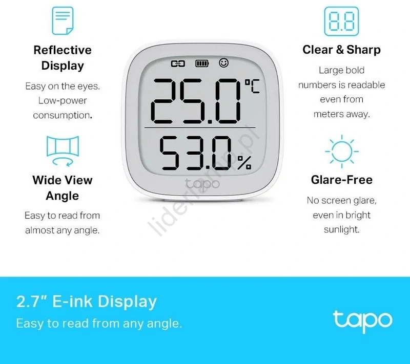 • Wyświetlacz z technologią e-ink – niskie zużycie energii i dobra czytelność.