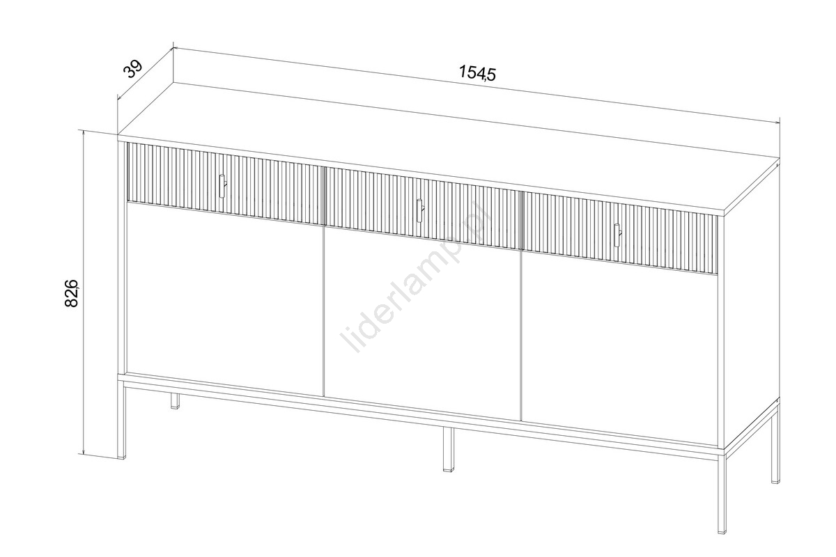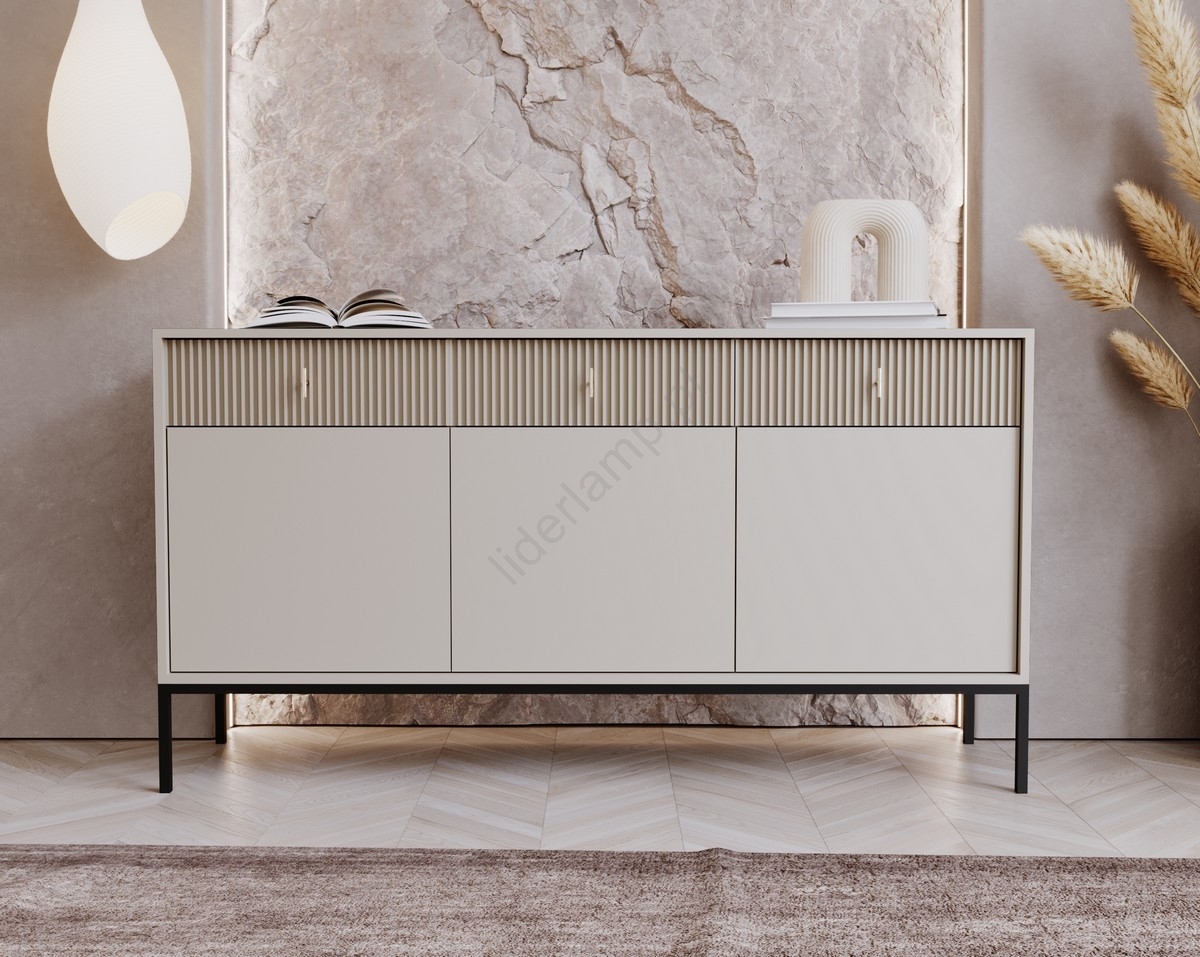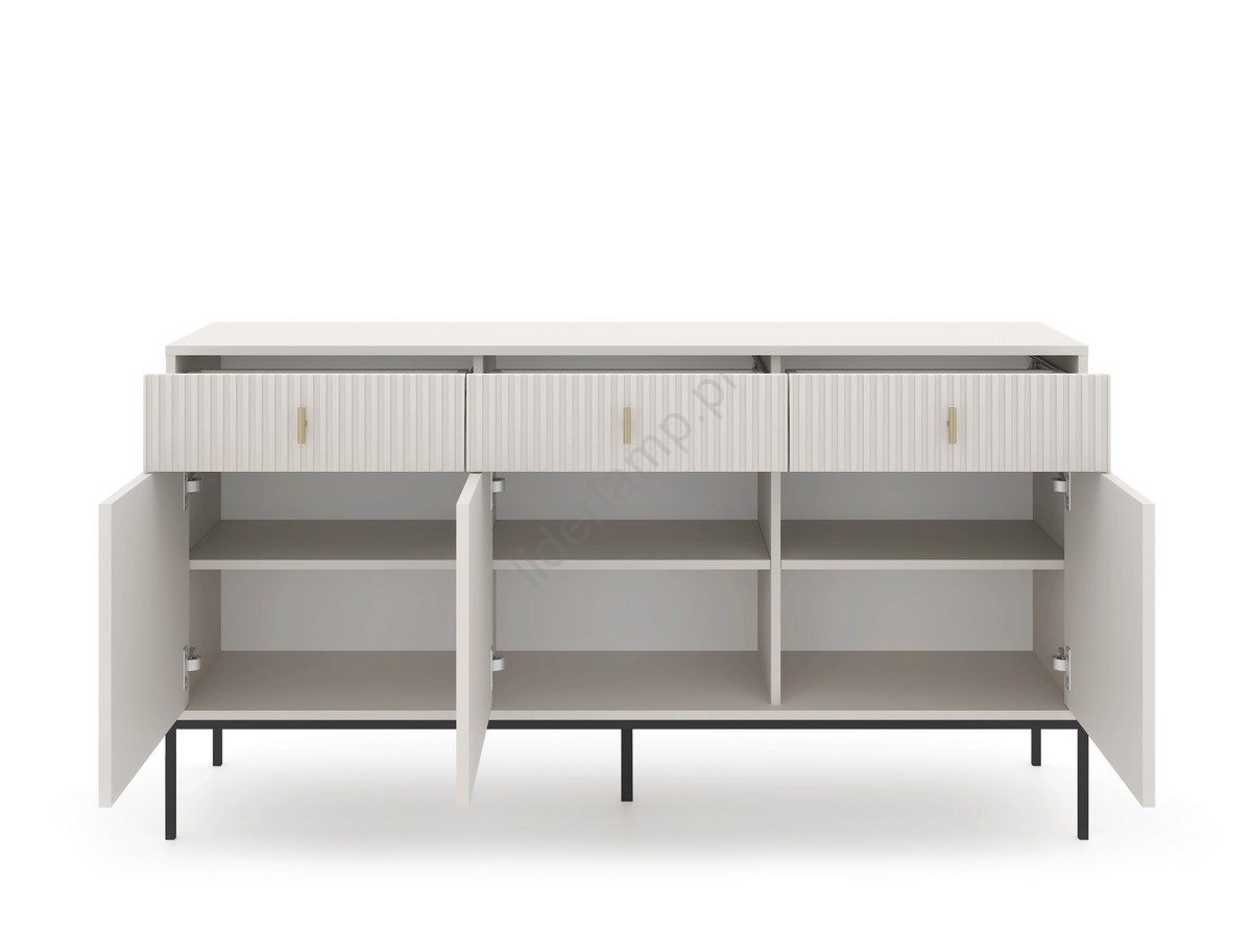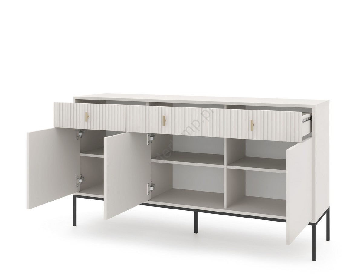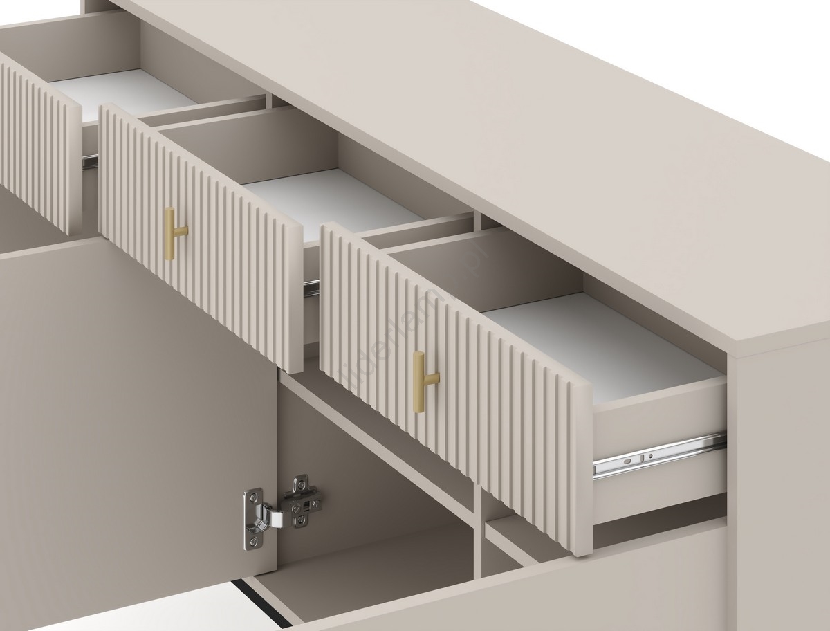 • Posiada trzy dolne drzwiczki z dużą pojemnością do przechowywania oraz trzy szuflady z uchwytami i pionowym żebrowaniem.