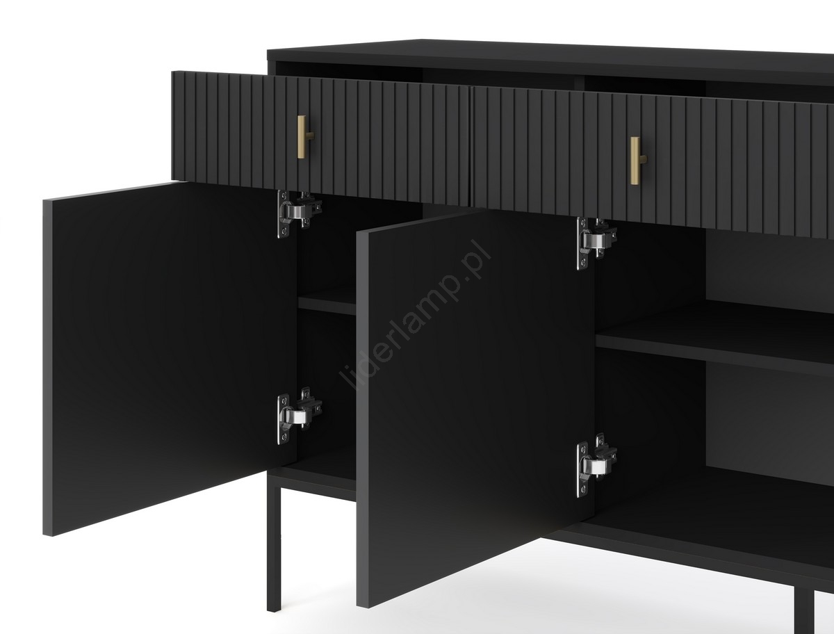 • Posiada trzy dolne drzwiczki z dużą przestrzenią do przechowywania oraz trzy szuflady z uchwytami i pionowym żebrowaniem.