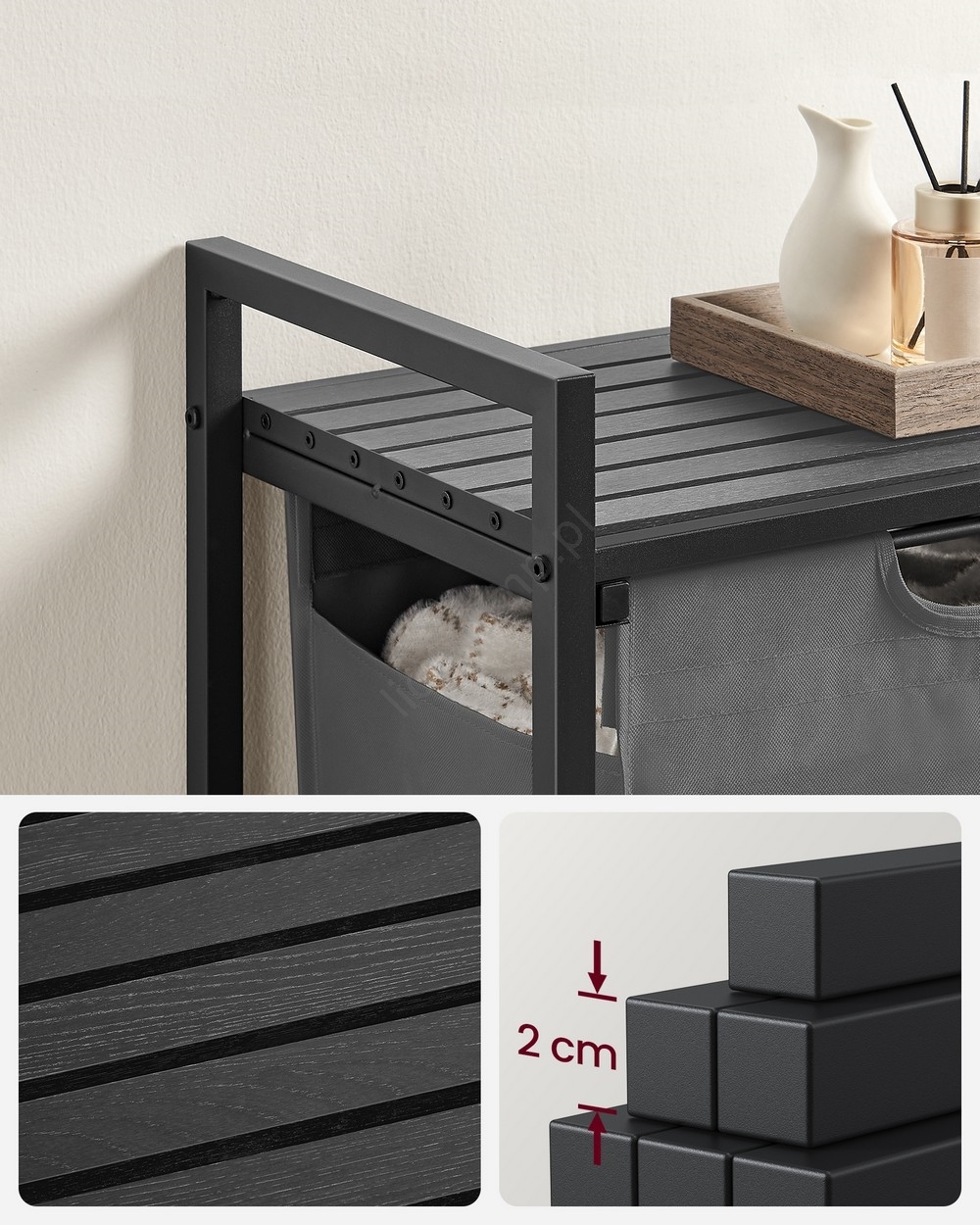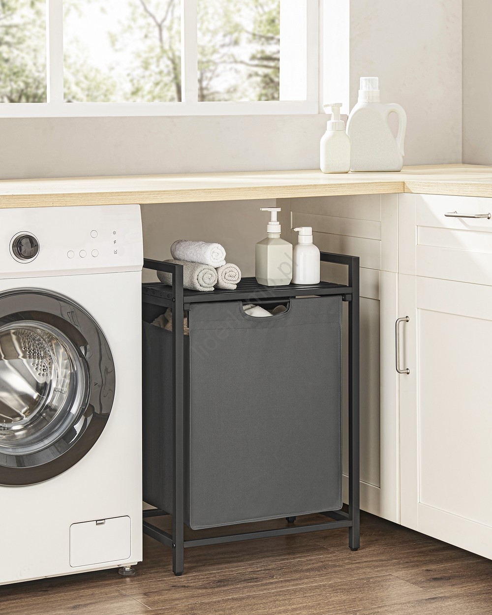 • 1 worek, 1 półka – Schowaj pranie do materiałowego worka (65 l) i umieść środki piorące, płyn do płukania i inne akcesoria na półce nad nim.