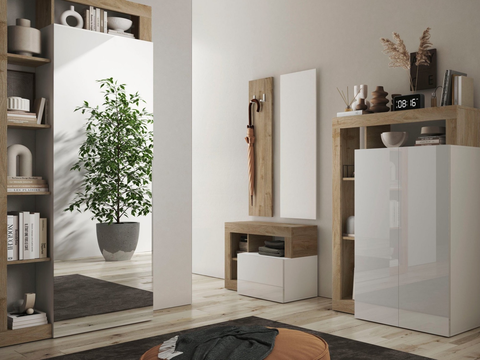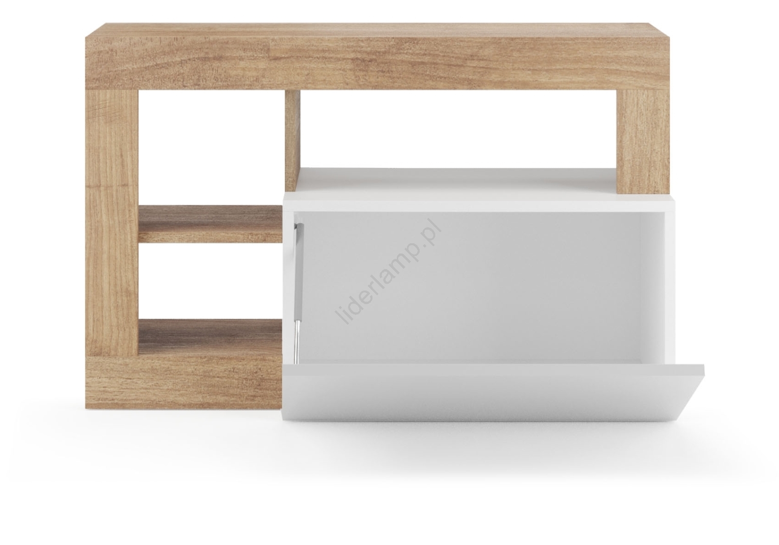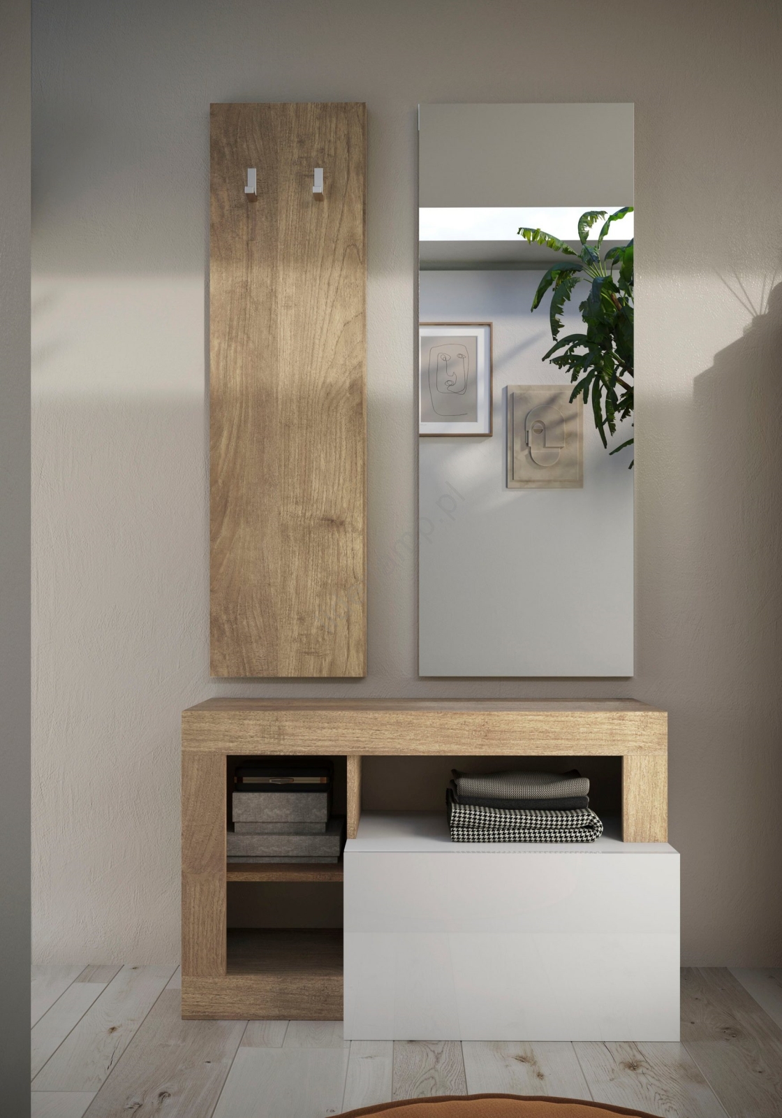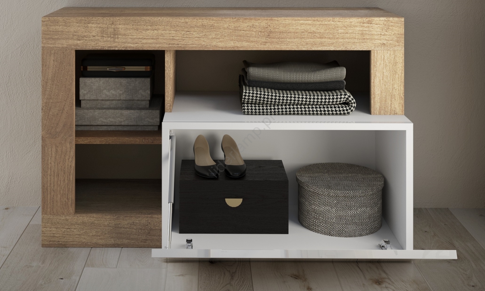 • Posiada 3 otwarte półki oraz wewnętrzną półkę z uchylnym frontem do przechowywania toreb, butów i sezonowych rzeczy.