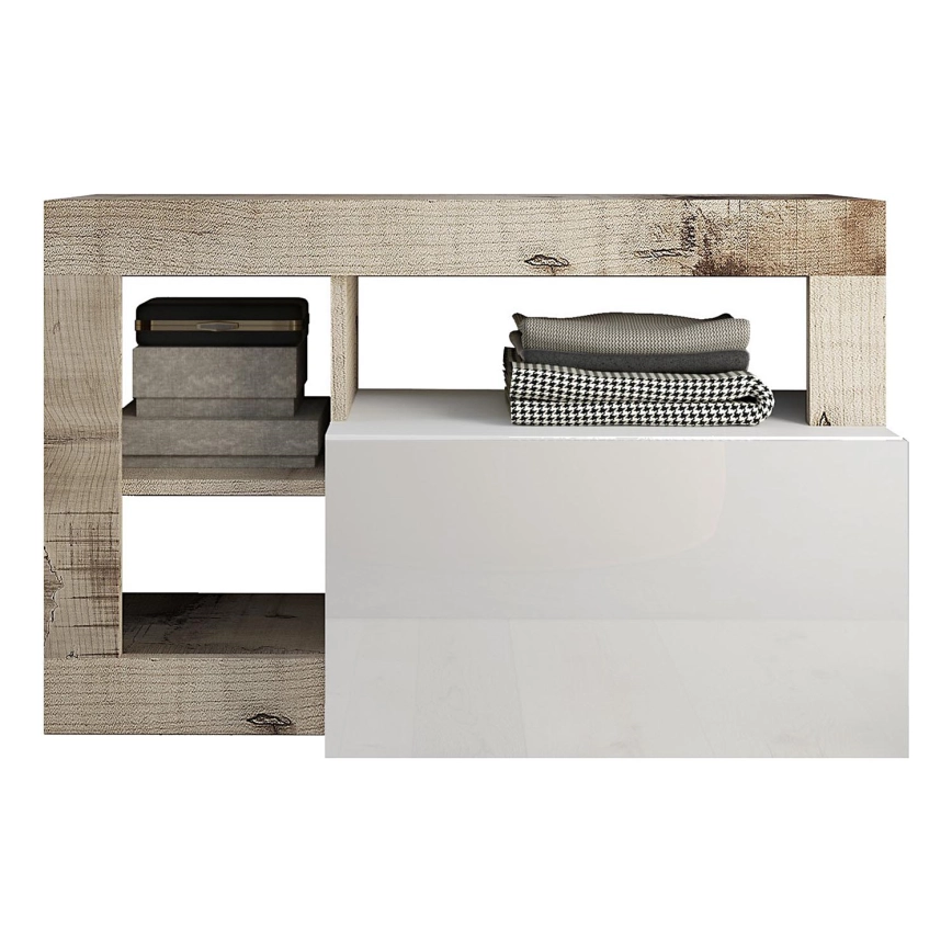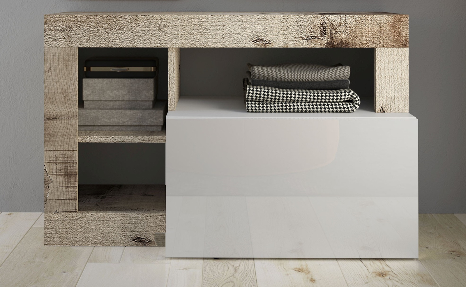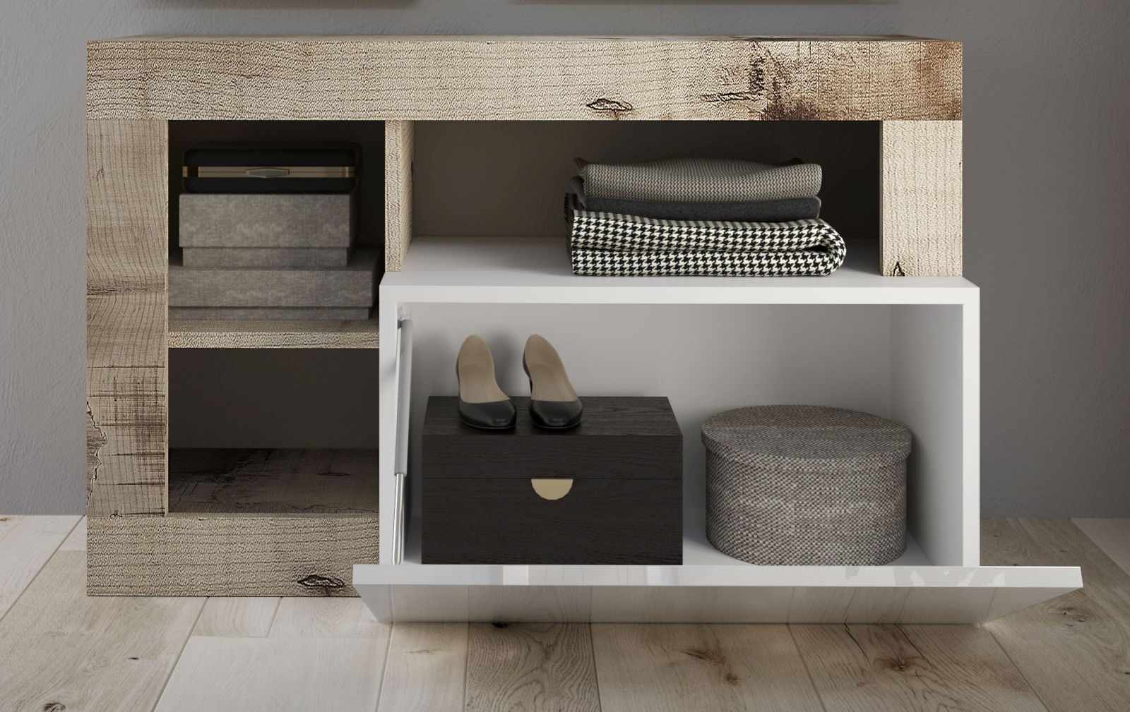 • Posiada 3 otwarte półki oraz wewnętrzną półkę z uchylnym otwieraniem do przechowywania toreb, butów i sezonowych rzeczy.