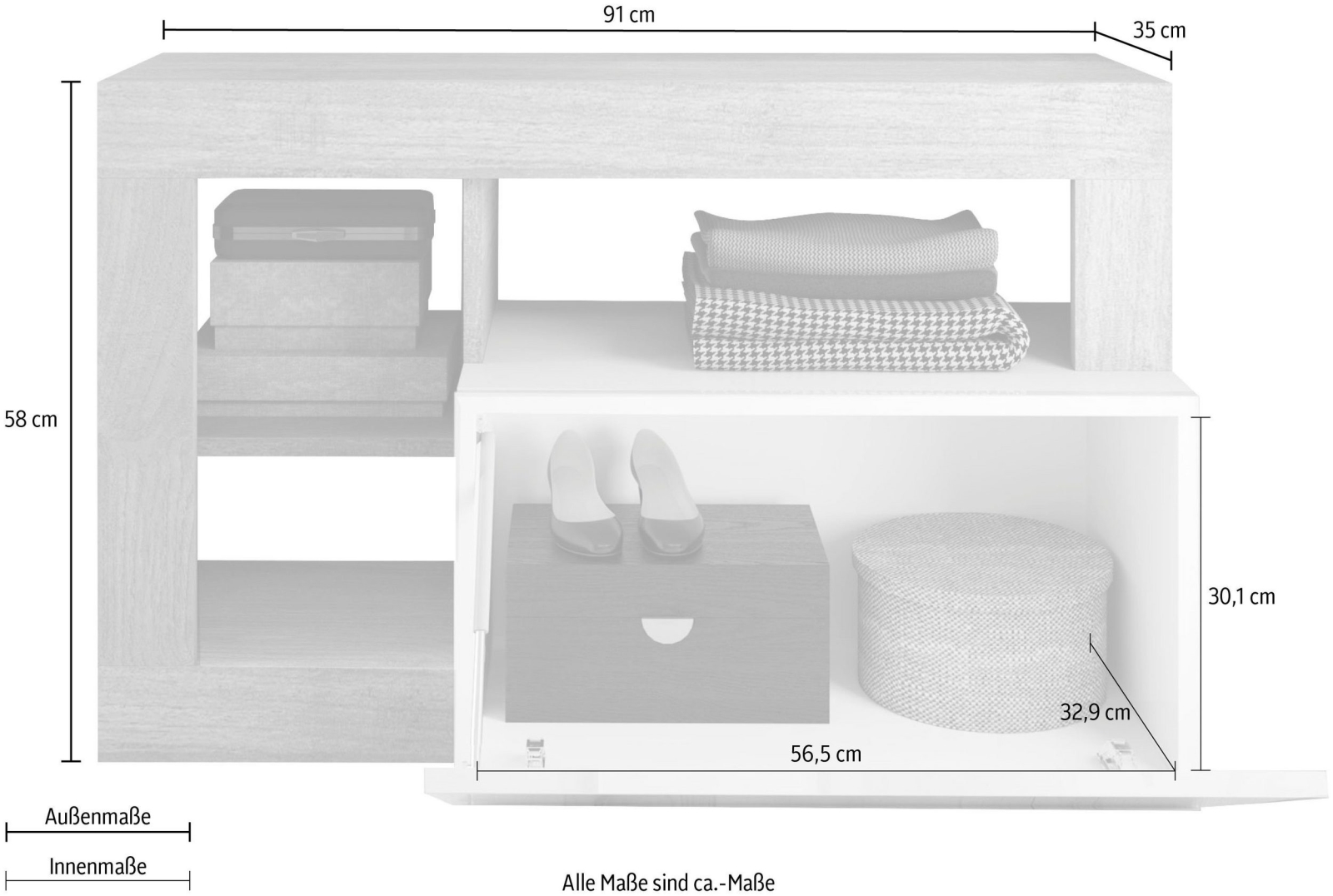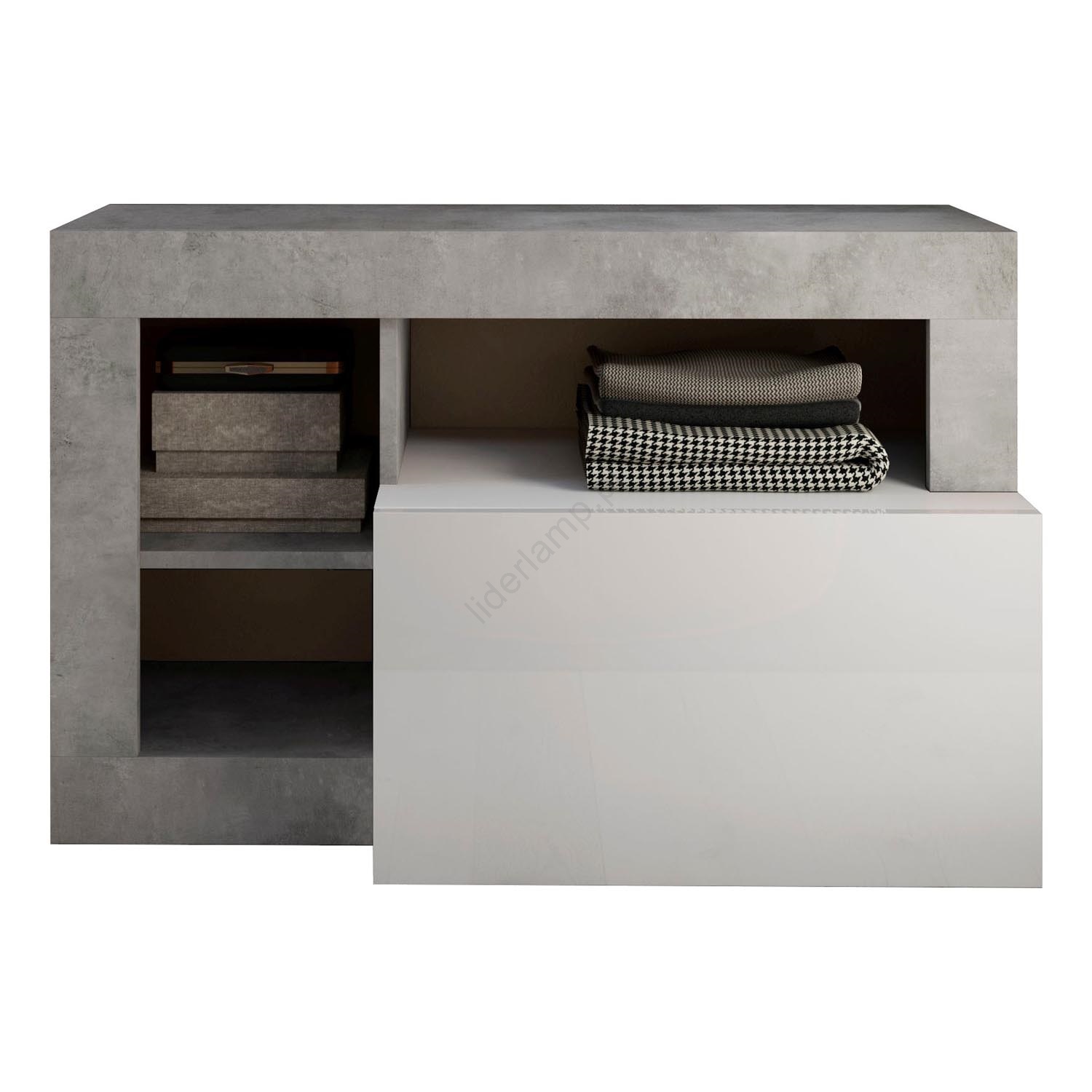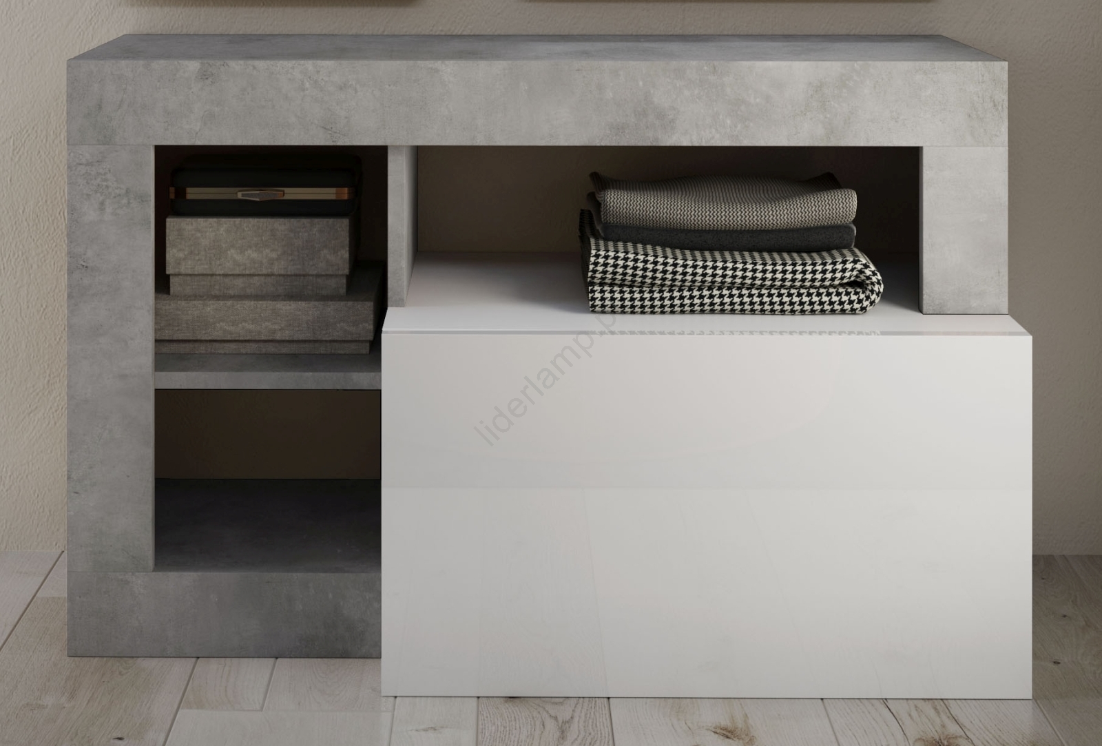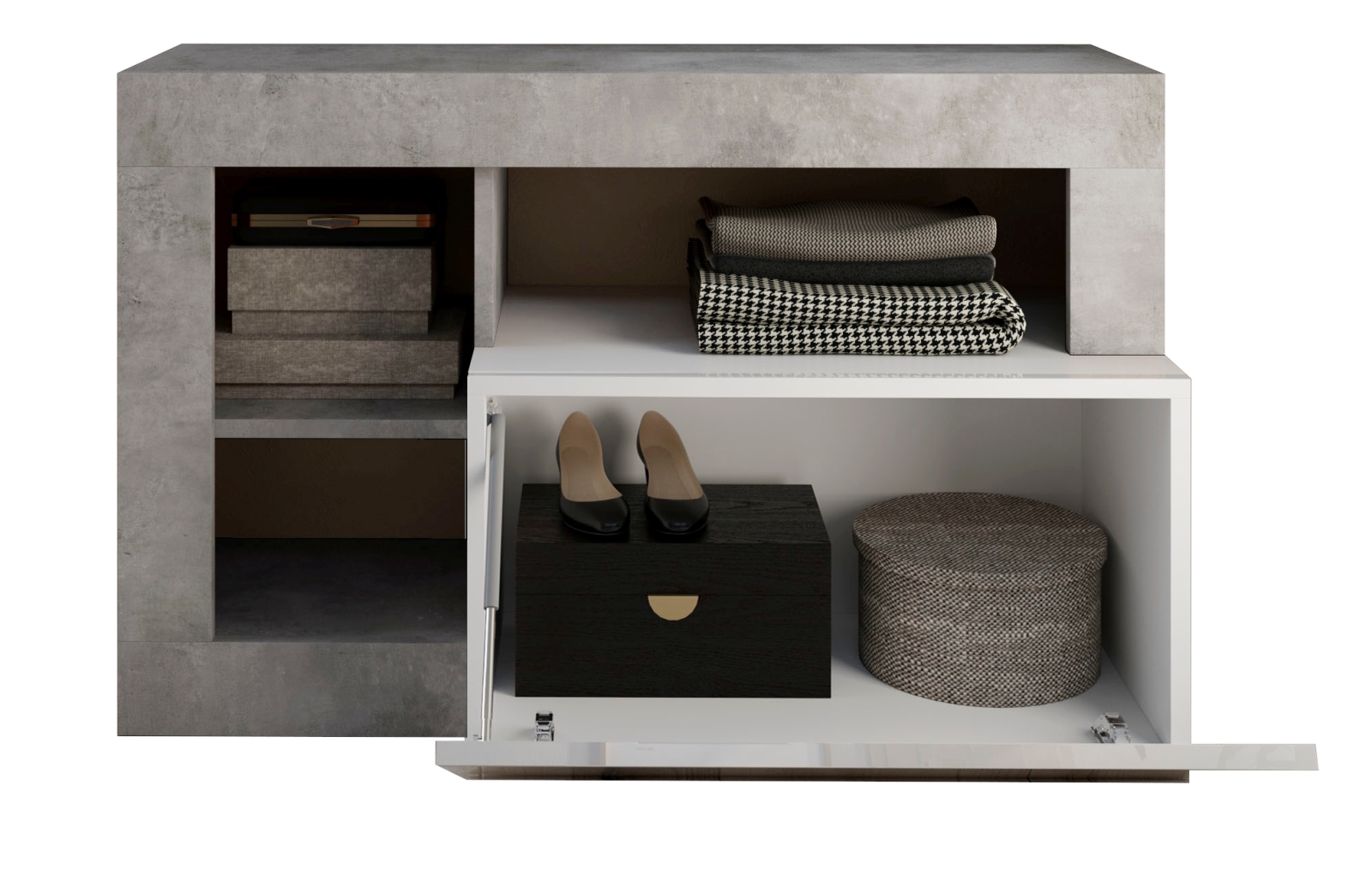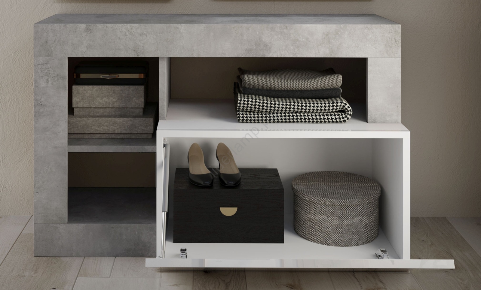 • Posiada 3 otwarte półki oraz wewnętrzną półkę z odchylaną klapą do przechowywania toreb, butów i sezonowych rzeczy.