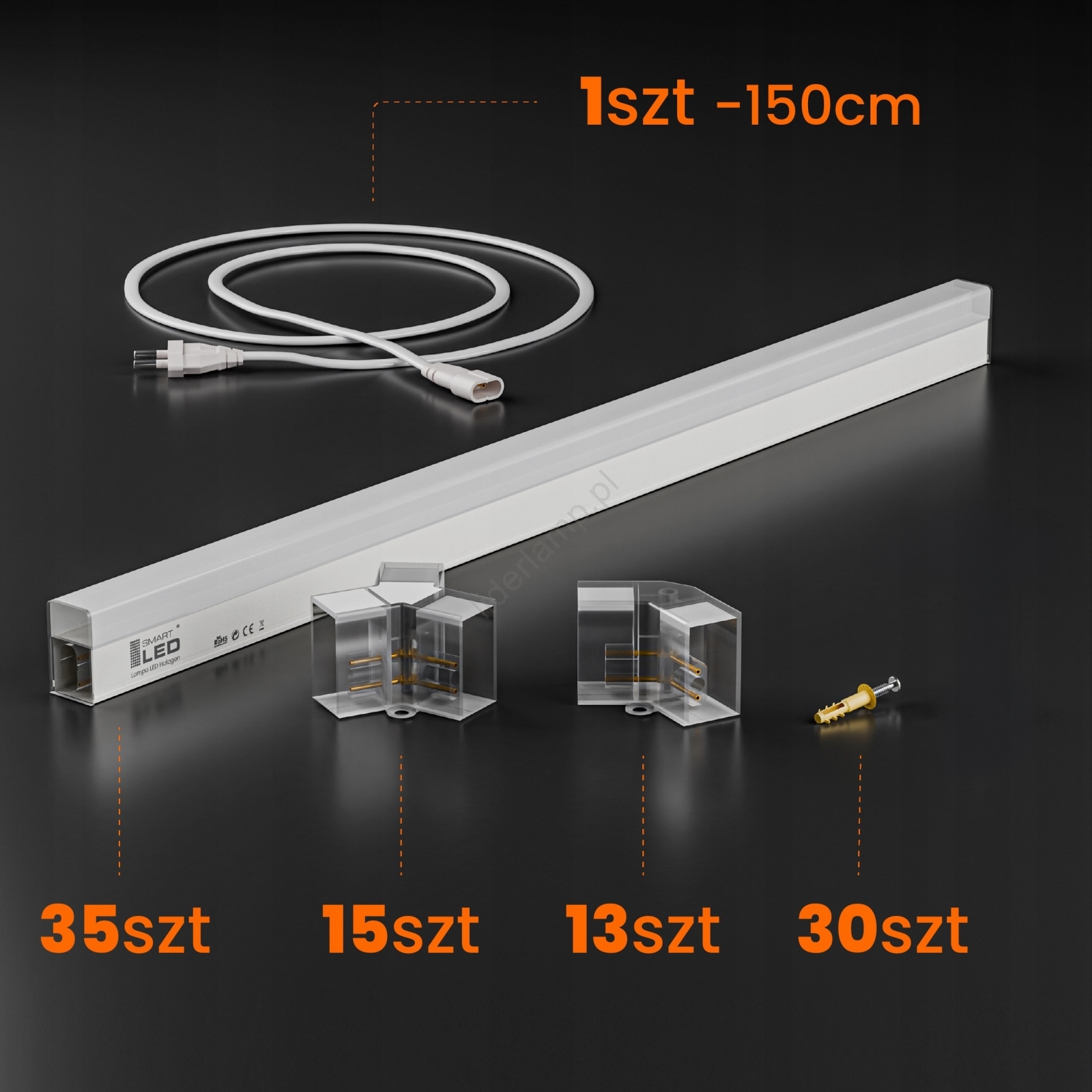 • Zawartość opakowania: przewód zasilający (150 cm), 35 paneli LED, 15 trójnych złączek, 13 łączników kątowych, 30 kołków rozporowych + śrub, akcesoria montażowe (plastowe oczka lub metalowe uchwyty według wyboru).