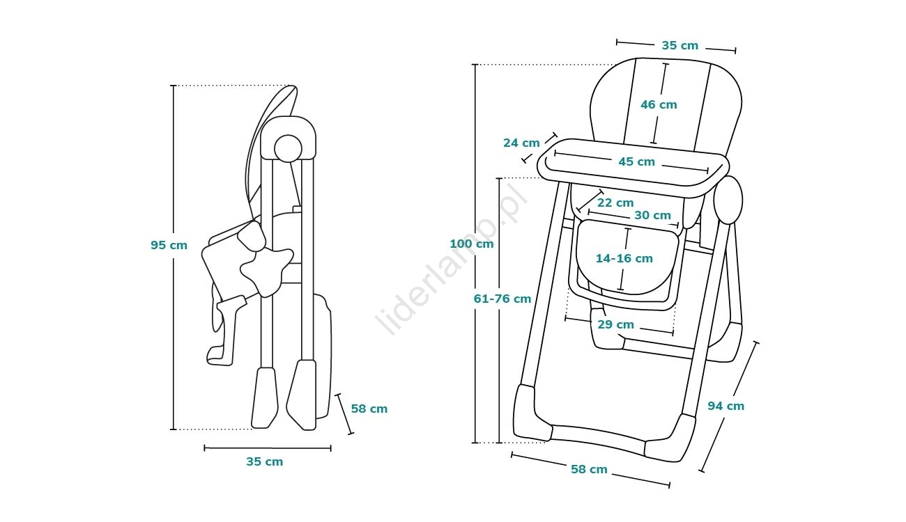 • Cztery wysokości krzesełka i wygodnie regulowane oparcie (aż do pozycji półleżącej).