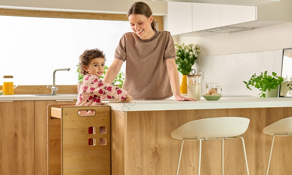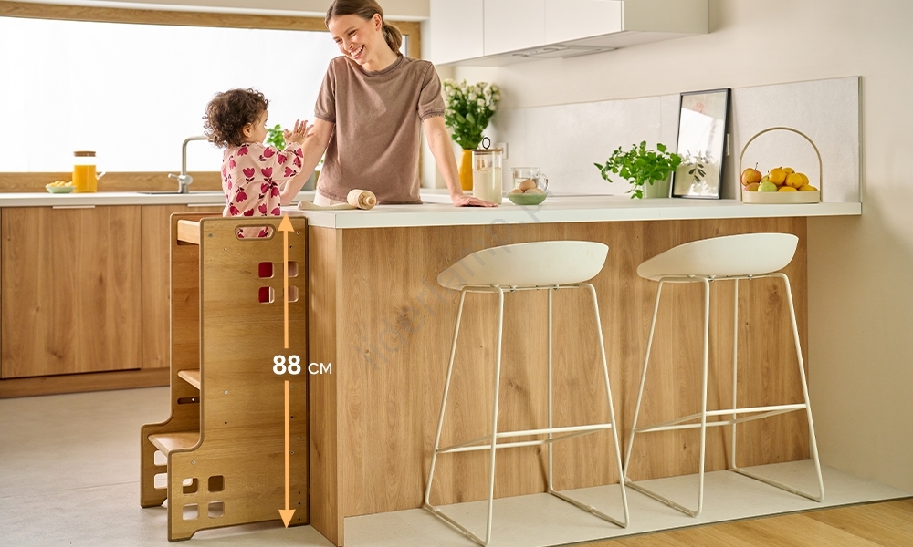 • Pozwala najmłodszym znaleźć się na wysokości blatu, widzieć wszystko, co robisz, i tworzyć razem z Tobą — dzięki temu masz też stały nadzór.