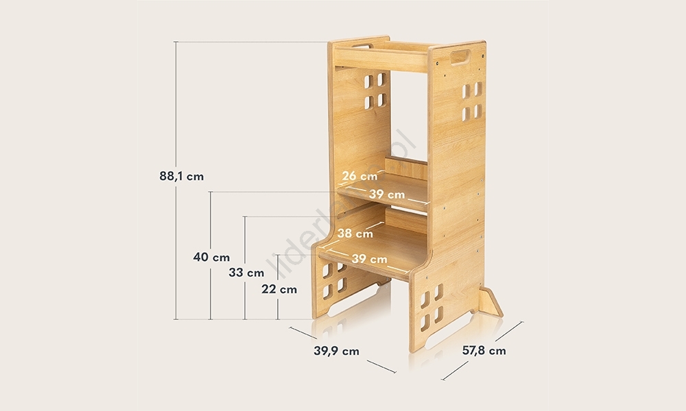 • Wieża składa się z platformy, na której stoi dziecko, stopnia umożliwiającego wspięcie się oraz ochronnej barierki wokół.