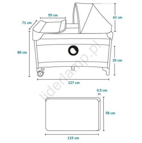 • W zestawie: przewijak z bocznymi kieszeniami (na pieluchy, puder itp.), koszyk na akcesoria z dwoma przegródkami, duża moskitiera, daszek i pałąk z pluszowymi zabawkami.