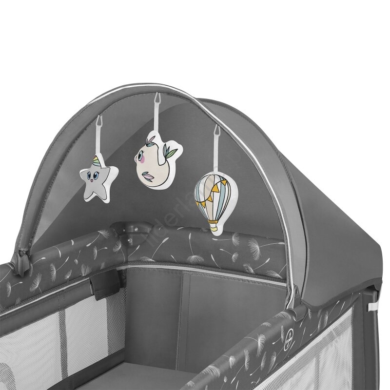 • W zestawie: przewijak z bocznymi kieszeniami (na pieluszki, puder itp.), koszyk na akcesoria z dwiema przegródkami, duża moskitiera, daszek oraz pałąk z pluszowymi zabawkami.
