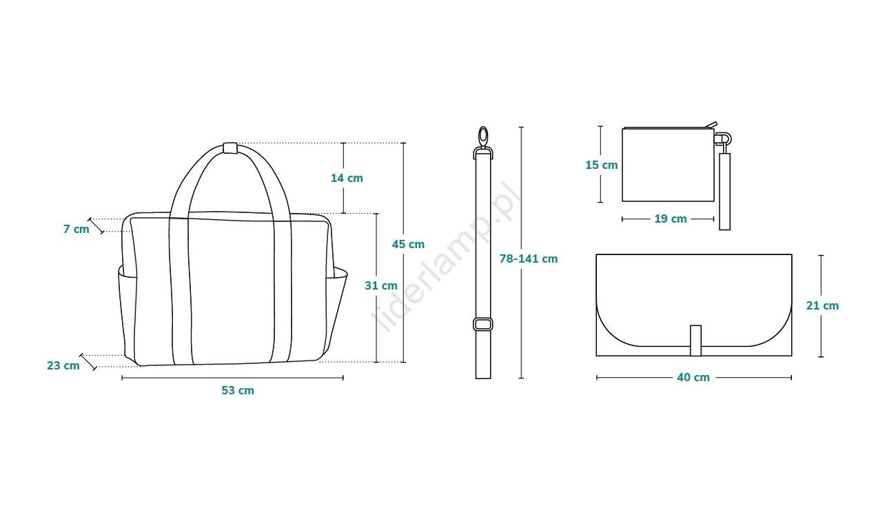 • W zestawie: pasek na ramię, mata do przewijania, kosmetyczka, uchwyty do wózka.