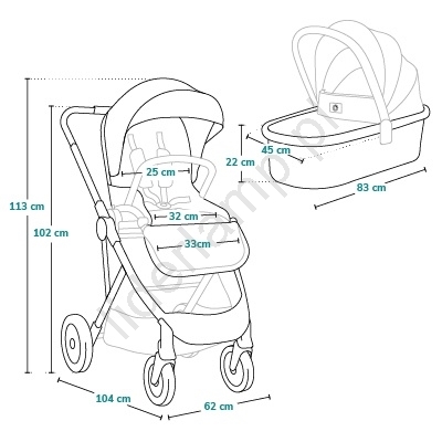 • W zestawie: torba, adaptery do fotelika samochodowego, moskitiera, osłona przeciwdeszczowa, dwa pokrowce na nóżki i mata do przewijania.