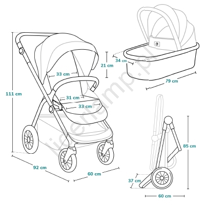 • Zestaw akcesoriów: osłona na nogi (mufka), folia przeciwdeszczowa, moskitiera, torba z kieszeniami i wzmocnionym dnem, adaptery do fotelika samochodowego.