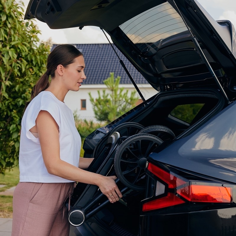 • Gondola z pochyleniem 3° przeciwnie do kierunku jazdy w celu zapobiegania refluksowi, adaptery z pamięcią, kieszeń wewnętrzna i zewnętrzna, składanie na płasko.