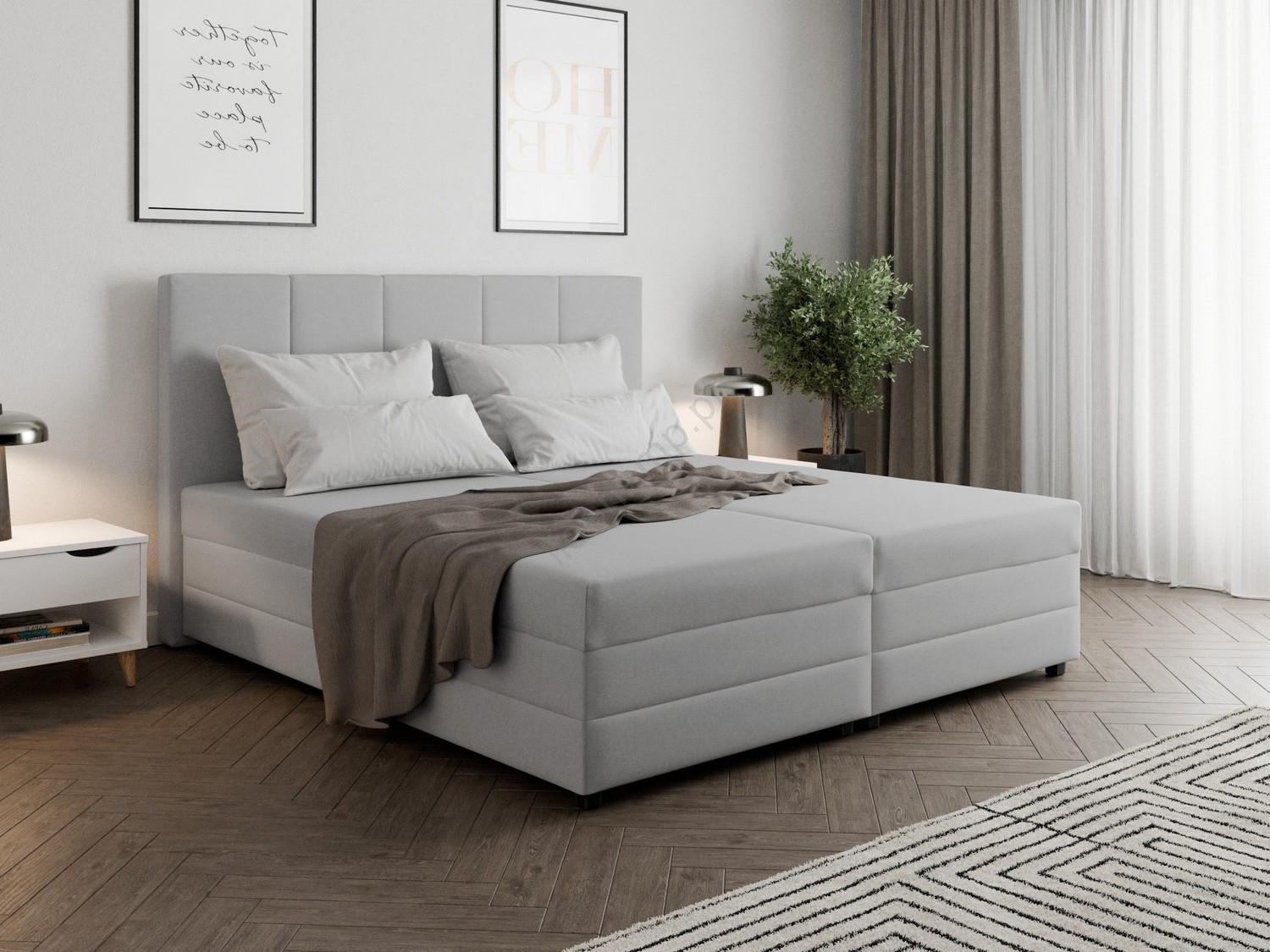 • Tapicerowane łóżko dwuosobowe z materacami sprężynowymi i wysokim, prostym, eleganckim zagłówkiem.