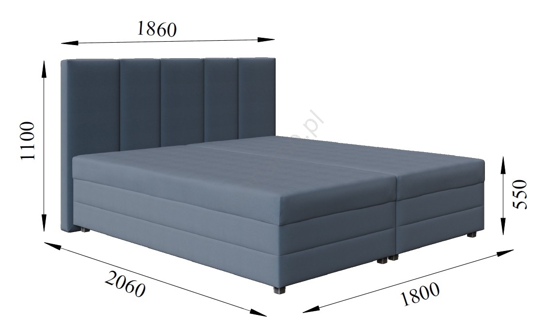 • Tapicerowane łóżko dwuosobowe z materacami sprężynowymi i wysokim, prostym i eleganckim wezgłowiem.