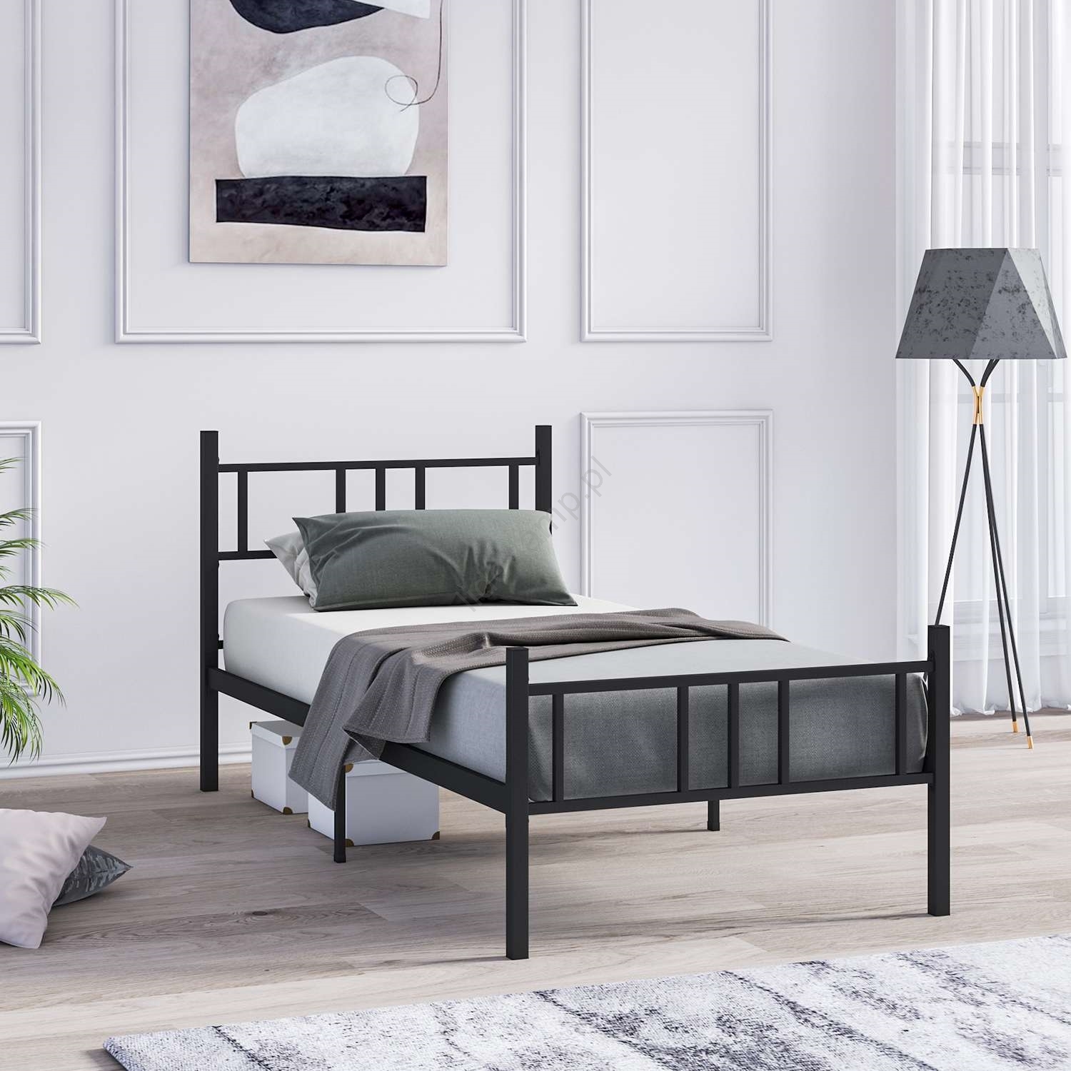 • Metalowe łóżko pojedyncze PIRON 90x200 cm czarne nośność 120 kg
