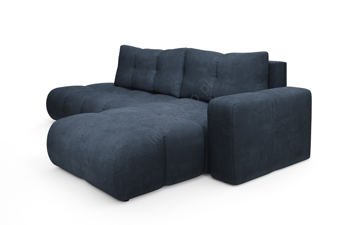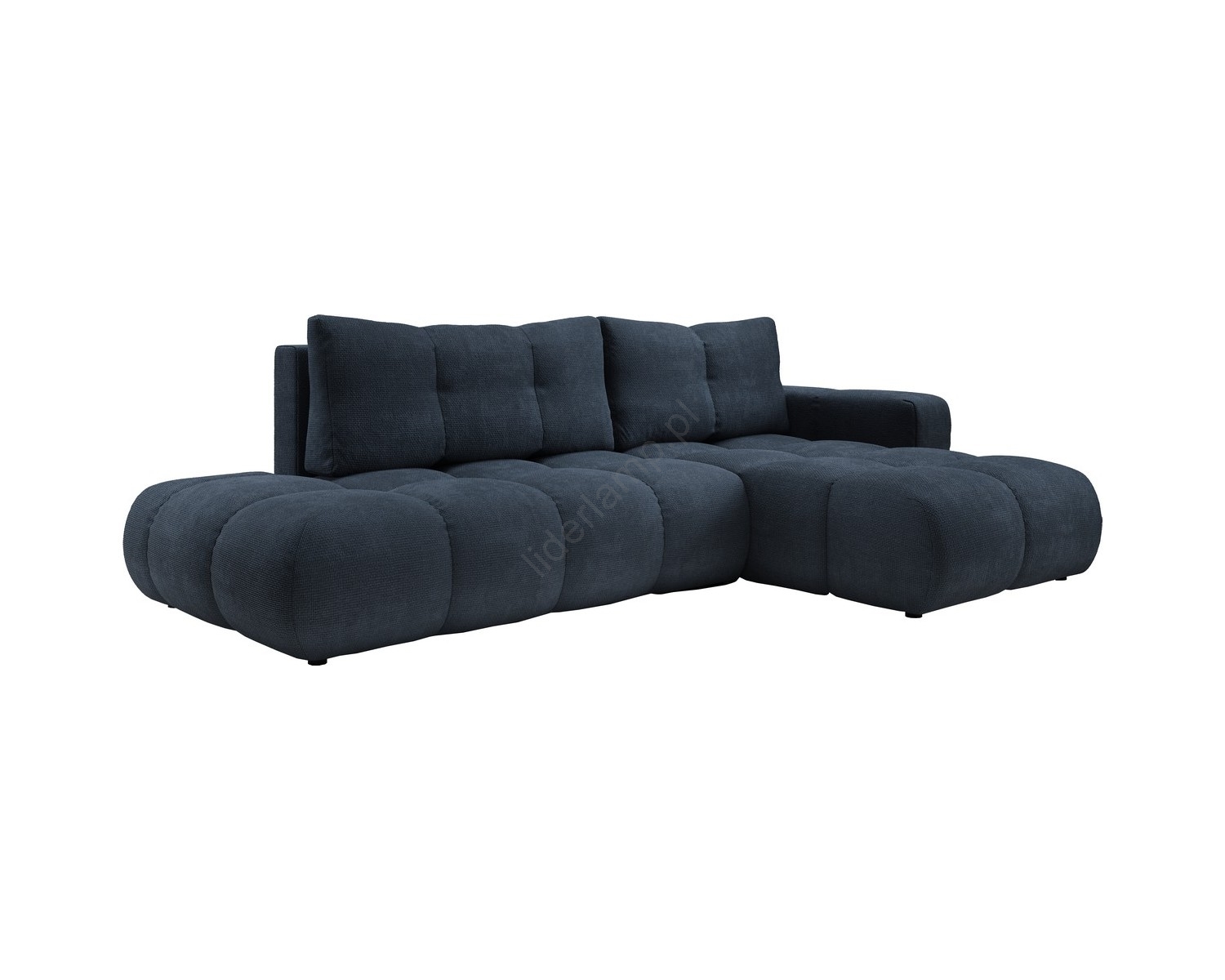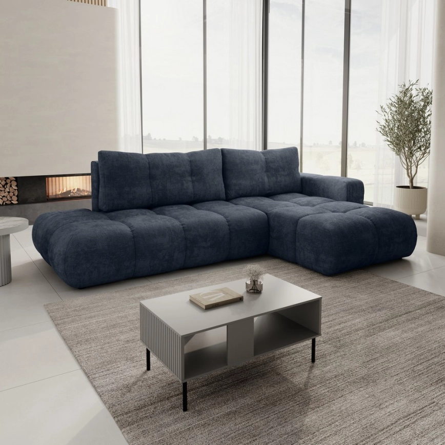 • Rozkładana narożna sofa tapicerowana ALMADA w układzie L, prawostronna, niebieska, z pojemnikiem na przechowywanie