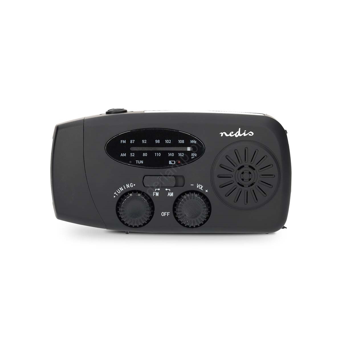 • Przenośne radio awaryjne AM/FM z korbką i panelem solarnym.