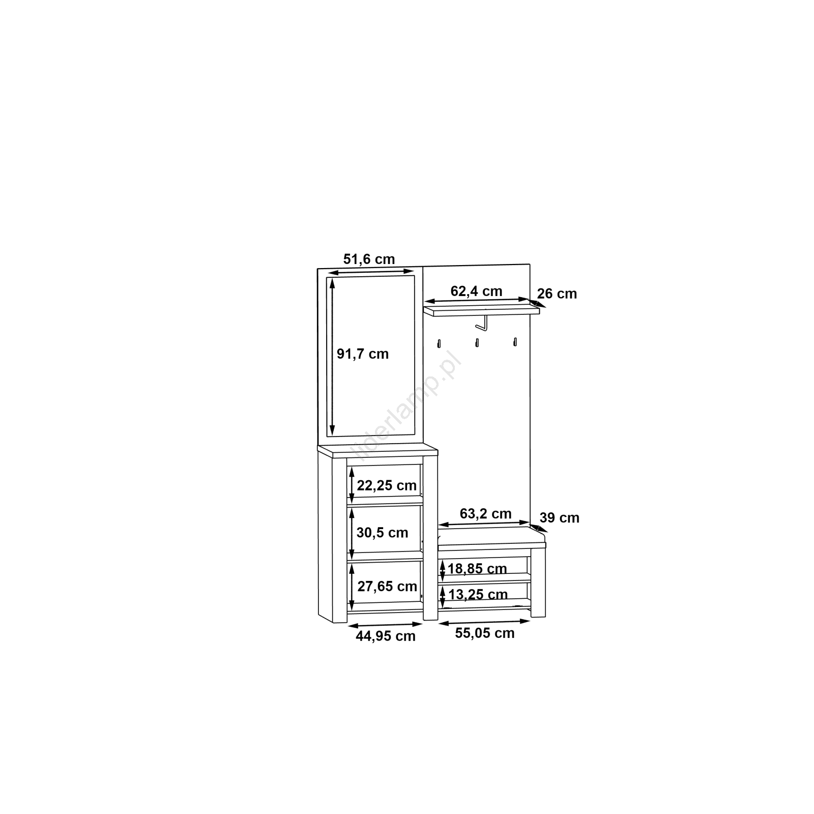 • Pod nim znajdują się zamykane schowki oraz półki na buty, akcesoria i inne codzienne niezbędniki.