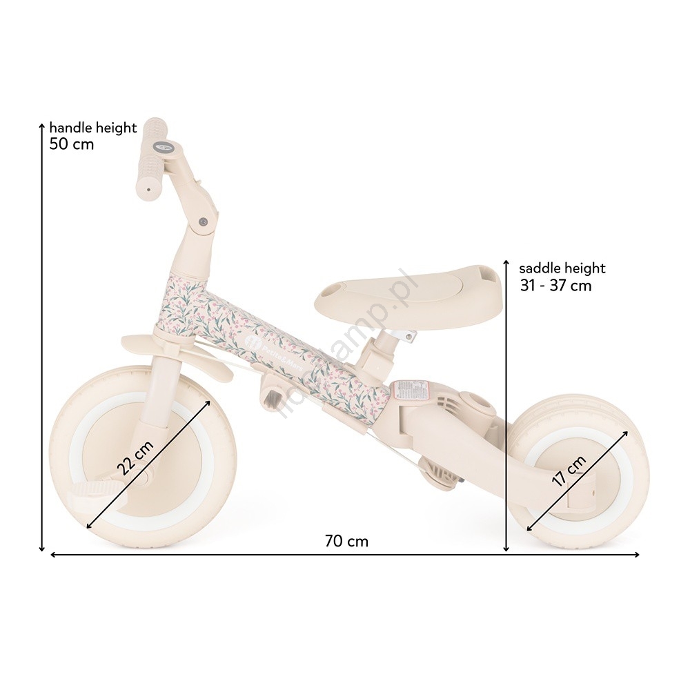 • Wymiary w wersji trójkołowej: długość: 67 cm, szerokość: 46 cm, wysokość (siodło): 31-37 cm.