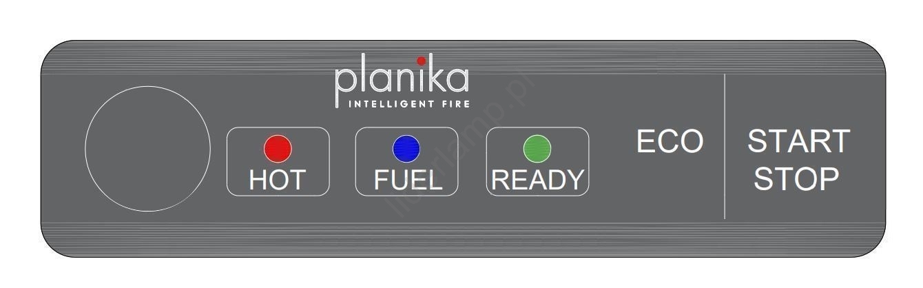 • Panel sterujący umożliwia ręczne włączanie i wyłączanie kominka, przełączanie na tryb ECO oraz sygnalizuje, kiedy zbiornik paliwa jest pusty, kiedy kominek jest gotowy do włączenia i kiedy jest przegrzany.