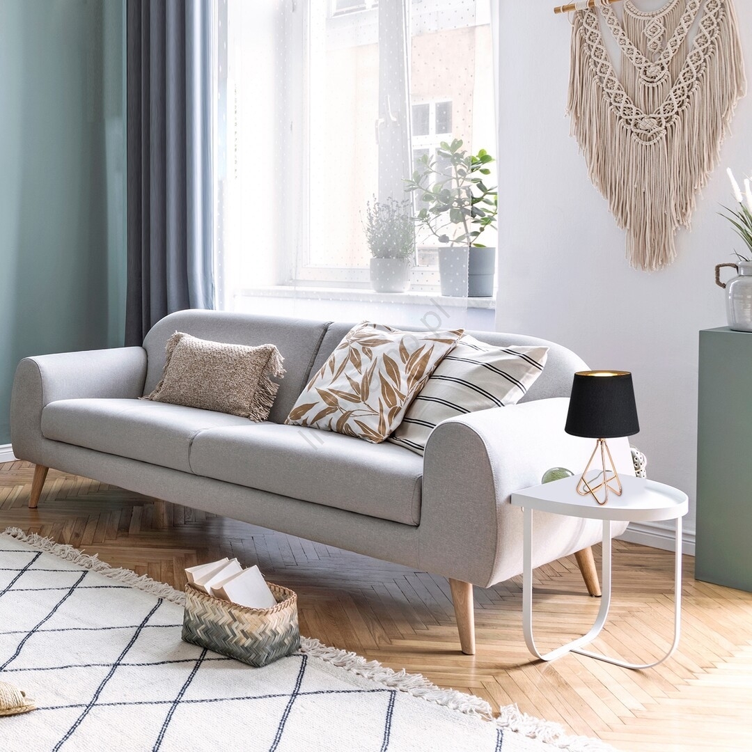 Lampa nocna Blanka, reprezentująca styl industrialny i wykonana w czarno-złotej kolorystyce, doskonale sprawdzi się na stoliku nocnym w sypialni lub na stoliku w salonie. Metalowa lampa wyposażona jest w tekstylny abażur oraz zaokrągloną, zakrzywioną ozdobną podstawę. Czarny abażur zapewnia, że lampa stołowa emituje dokładnie tyle światła, ile potrzeba, gdy w nocy potrzebujemy delikatnego oświetlenia. Lampa Blanka może być używana z jednym źródłem światła o mocy do 40W, z gwintem E14. Do wyboru jest ciepła lub naturalna biała temperatura barwowa. Lampę stołową można włączać i wyłączać za pomocą przełącznika na kablu. Wysokość lampy nocnej Blanka wynosi 290 mm, a średnica abażura to 170 mm. Model dostarczany jest bez źródła światła.